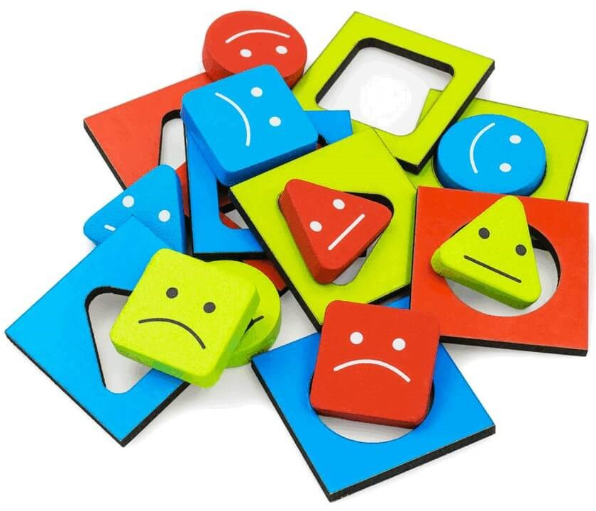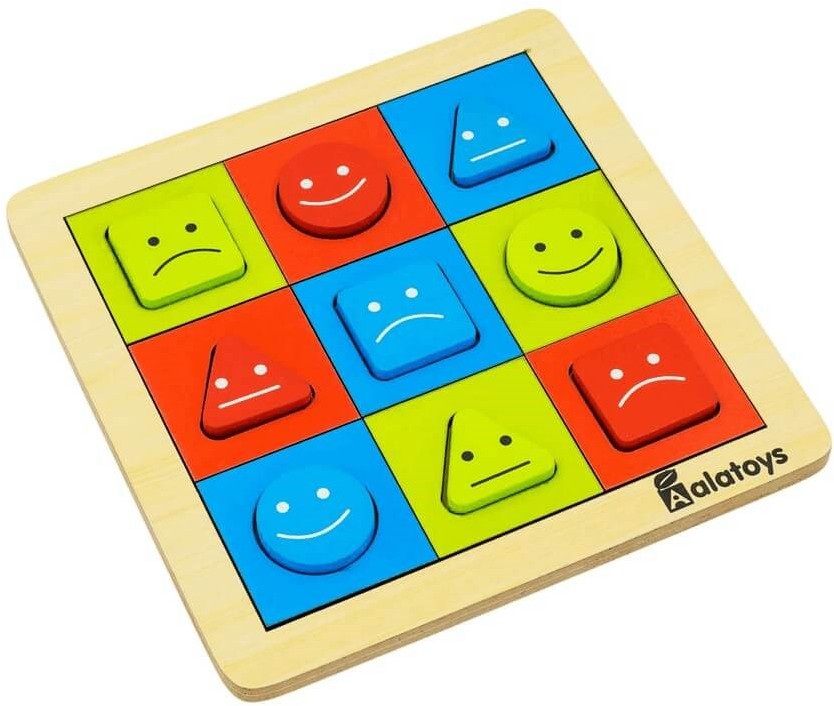 Подсказка для взрослых: начните размещать детали по диагоналям. Первая диагональ — рамки одинакового цвета, вторая диагональ — разных цветов. Потом поставьте оставшиеся рамки так, чтобы в рядах они не повторялись. Так же расставьте детали: по одной диагонали одной формы, по другой — разные . Добавьте оставшиеся фигуры на основание. Такая игра потренирует логическое мышление и усидчивость ребёнка.