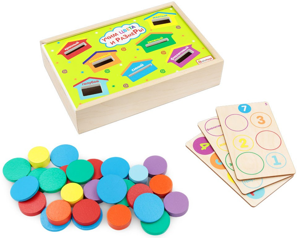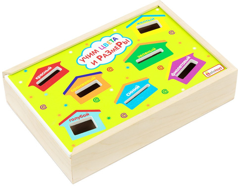 Сортер — современная развивающая игрушка, предназначенная для сортировки предметов по форме. Сортер «Учим цвета и размеры» от Алатойс — дидактический материал для занятия с дошкольниками. Он состоит из деревянного ящичка, функциональной яркой двусторонней крышки с прорезями разного размера, набора из объемных разноцветных геометрических фигур и трех двусторонних деревянных карточек с заданиями.