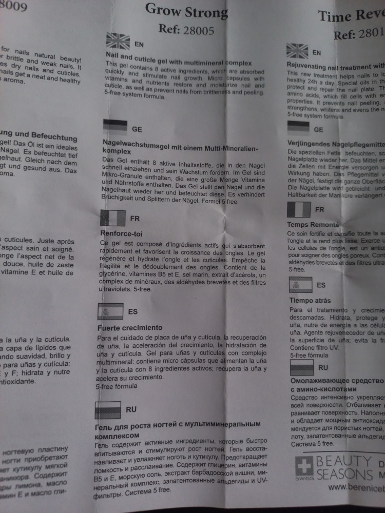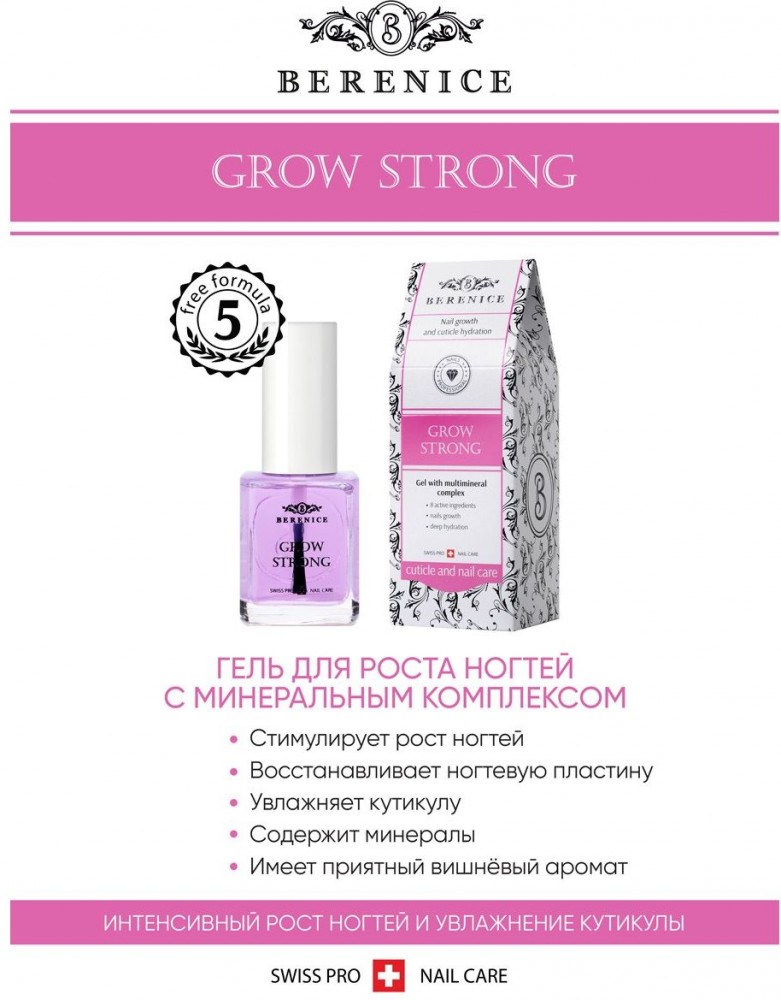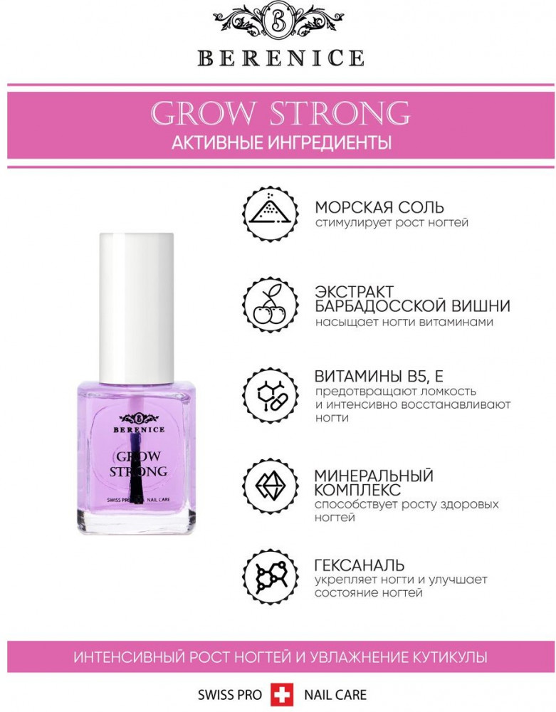 Berenice Гель для роста ногтей с мультиминеральным комплексомВ данный момент этот товар отсутствует в продаже. Возможно, у нас найдется аналогичный или похожий товар здесь. Гель для роста ногтей Grow Strong содержит 8 активных ингредиентов, которые быстро впитываются в ноготь и стимулируют его рост. В составе геля есть микро-гранулы, содержащие большое количество витаминов и питательных веществ. |