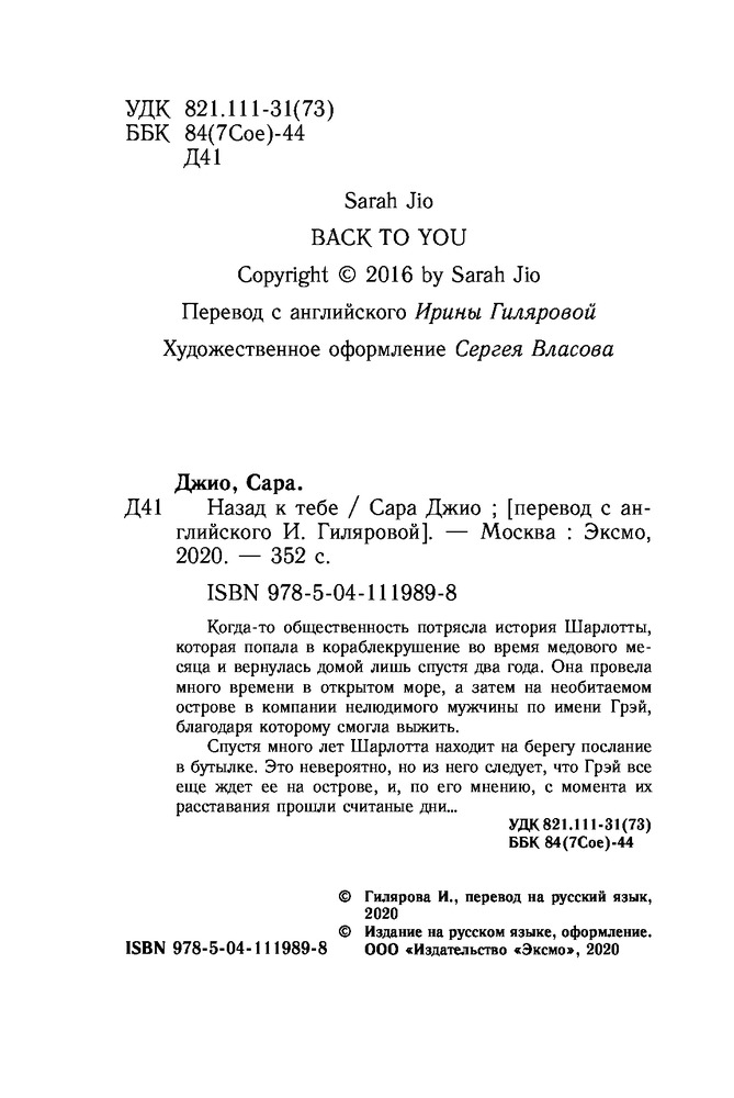 💳 Оплатить за товар можно при получении 🇰🇿 Есть бесплатная доставка по Казахстану от 1 дня 🎁 Копите бонусы с каждой покупки Серия: Зарубежный романтический бестселлер. Романы Сары Джио и Карен Уайт (обложка) Когда-то общественность потрясла история Шарлотты, которая попала в кораблекрушение во время медового месяца и вернулась домой лишь спустя два года. Она провела много времени в открытом море, а затем на необитаемом острове в компании нелюдимого мужчины по имени Грэй, благодаря которому смогла выжить. |