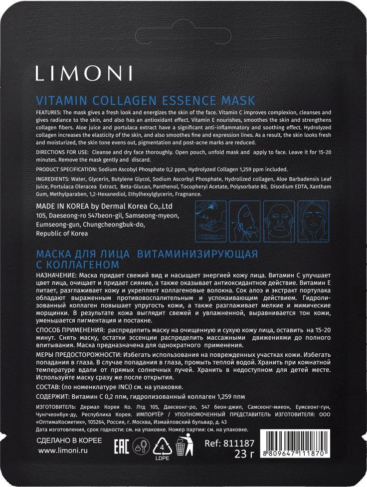 Limoni Маска для лица тканевая витаминизирующая с коллагеном