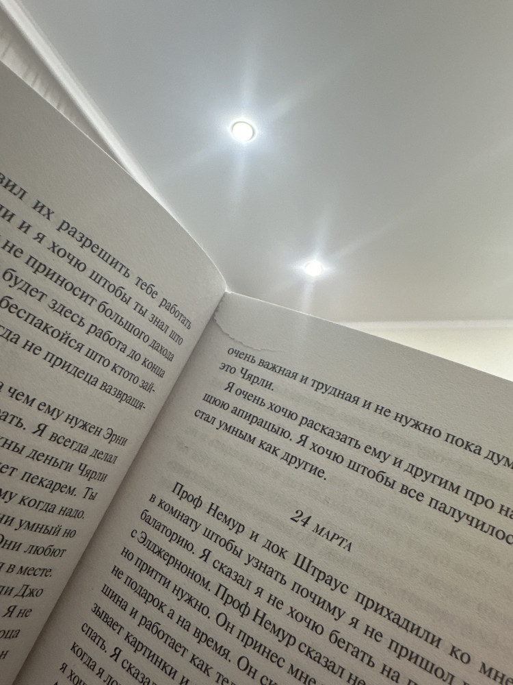 Начну с минусов. Во-первых,очень долгая доставка.9-10 дней точно было в пути. Во-вторых,потрёпанные уголки книги. А что касается содержания книги, то 50/50. Местами было скучно читать,может,мне лучше выбирать романы или детективы) Но с другой стороны было интересно читать про меняющееся состояние Чарли.