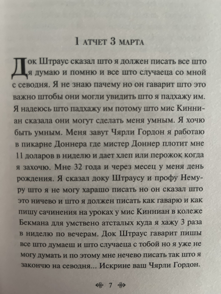 В начале подумала что за ошибки. Потом поняла что это книга про умственно отсталый человеке. Он писал отчет для ученых, докторов. По этому в начале было много ошибок. У Чарли с детство в душе не было покоя, мать которая всегда бесилась, а как только родила здорового второго ребенка, она отправила сына приют для нездоровых людей. Он не понимал что все люди издеваются над ним. Как только ученные начали эксперимент над ним он согласился на операцию на мозг. После этого он стал все больше умнее и умнее. Но все равно прошлое не оставляет его в покое. А Элджернон это тоже по опытный крыса, 🐁белая. Тоже на него делали эксперименты. Тоже со временем стал умным. Все лабиринты он прошел спокойна. Тоже со временем он стал запутаться и стал агрессивным и умер в конце. И тоже такое состояние ждало и Чарли. 😭