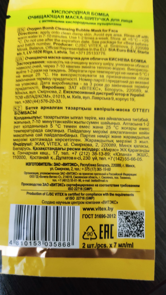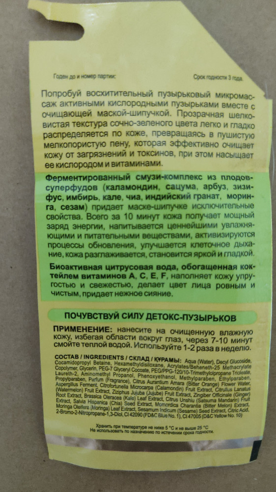 Маску покупаю не первый раз.Замечательная,забавное ощущение с лопающимися пузырьками-поднимает настроение))).Качественная,эффект как говорится на лице.Делю каждую порцию на 2.
