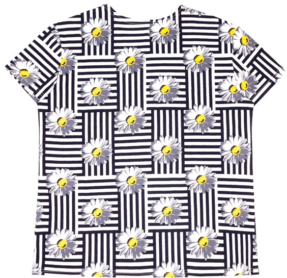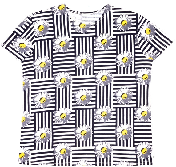 Футболка выполнена из легкого хлопкового полотна. Изделие свободного покроя с короткими рукавами и округлым вырезом горловины.