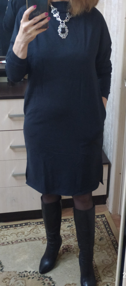 Из плюсов: ткань приятна телу, фасон позволяет чувствовать себя в платье комфортно. Из минусов: без хорошей бижутерии и других аксессуаров платье выглядит слишком просто и дёшево. На рост 168, вес 63кг размер 46 сидит достаточно свободно (визуально добавляет объем в талии и бедрах), длина платья ниже ожидаемой. фото прилагаю
