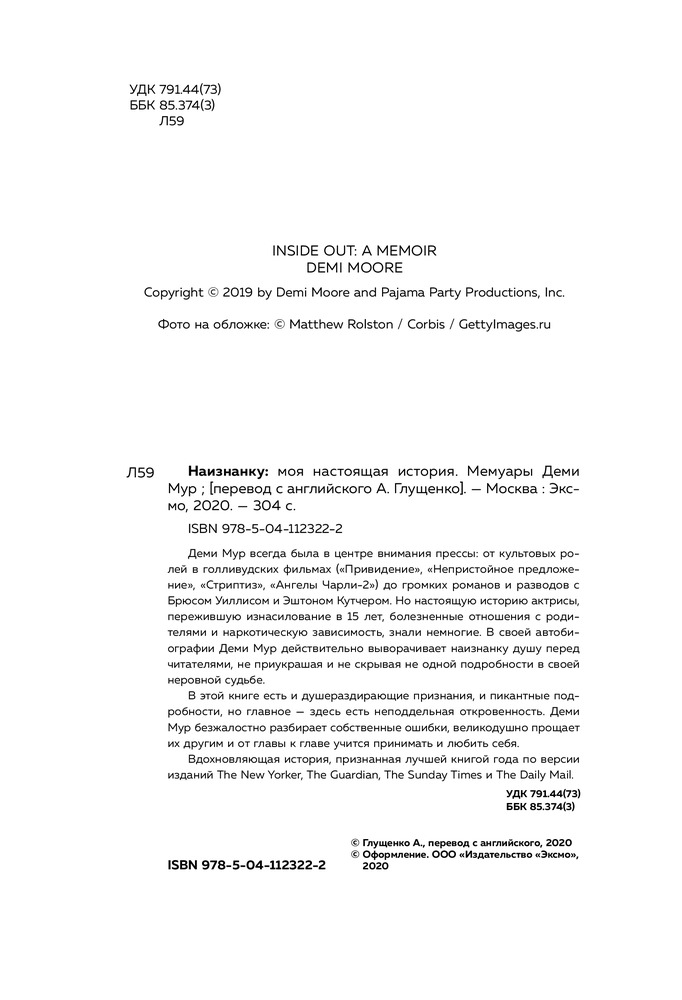 В данный момент этот товар отсутствует в продаже. Возможно, у нас найдется аналогичный или похожий товар здесь. Серия: Иконы кино. Биографии великих деятелей кинематографа Деми Мур всегда была в центре внимания прессы: от культовых ролей в голливудских фильмах («Привидение», «Непристойное предложение», «Стриптиз», «Ангелы Чарли-2») до громких романов и разводов с Брюсом Уиллисом и Эштоном Кутчером. Но настоящую историю актрисы, пережившую изнасилование в 15 лет, болезненные отношения с родителями и наркотическую зависимость, знали немногие. В автобиографии Деми Мур действительно выворачивает наизнанку душу перед читателями, не приукрашая и не скрывая не одной подробности в своей неровной судьбе. В этой книге есть и душераздирающие признания, и пикантные подробности, но главное — здесь есть неподдельная откровенность. Деми Мур безжалостно разбирает собственные ошибки, великодушно прощает их другим и от главы к главе учится принимать и любить себя. Вдохновляющая история, признанная лучшей книгой года по версии изданий The New Yorker, The Guardian, The Sunday Times и The Daily Mail. |