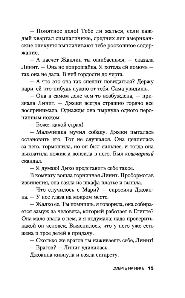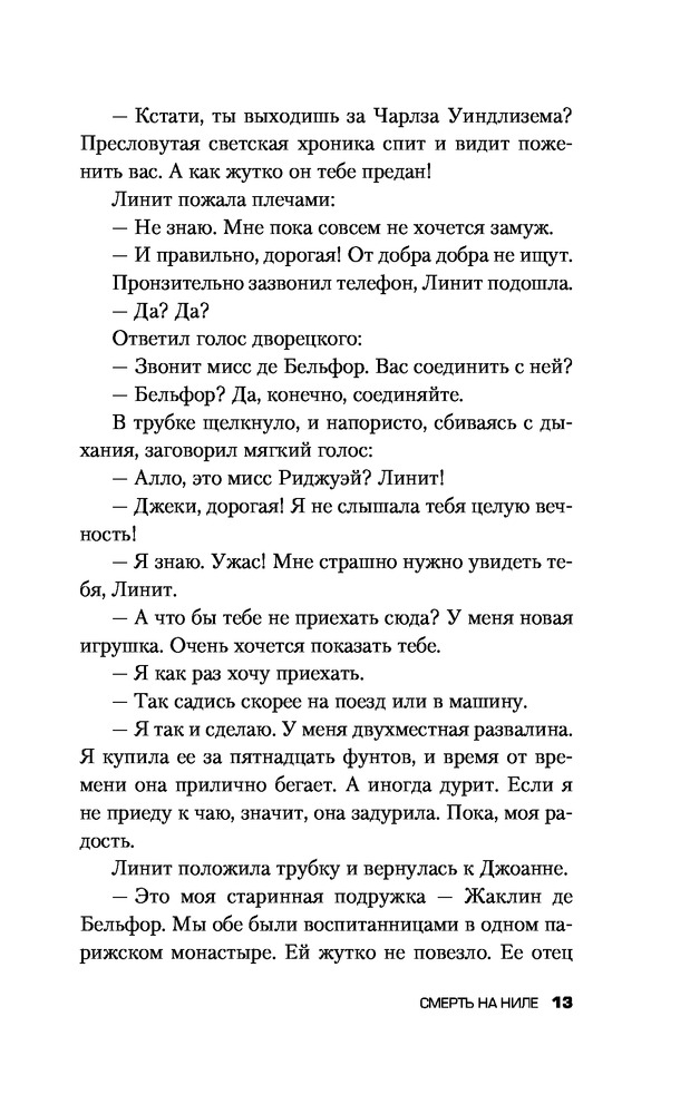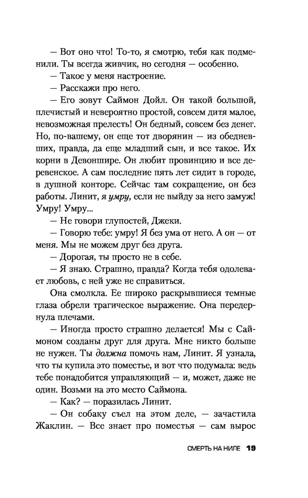 Смерть на Нилетвёрдый переплёт красивая обложка захватывающий сюжет легко читается В данный момент этот товар отсутствует в продаже. Возможно, у нас найдется аналогичный или похожий товар здесь. Серия: Кинопремьера мирового масштаба На роскошном пароходе «Карнак», плывущем по Нилу, убита молодая миллионерша, недавно вышедшая замуж и, как выяснилось, имевшая множество врагов среди пассажиров. Любой мог убить самоуверенную и нагловатую девушку, укравшую жениха у лучшей подруги. Но ни один из вероятных подозреваемых не совершал этого преступления... К счастью, на пароходе находится великий сыщик Эркюль Пуаро, который знает все общество, представленное в круизе, еще по Лондону, и в курсе возможных мотивов каждого из присутствующих. И, конечно, первое, о чем задумывается бельгиец, — это о «любовном треугольнике», состоявшем из убитой, ее свежеиспеченного мужа и очень темпераментной женщины, которую тот бросил ради миллионерши... |