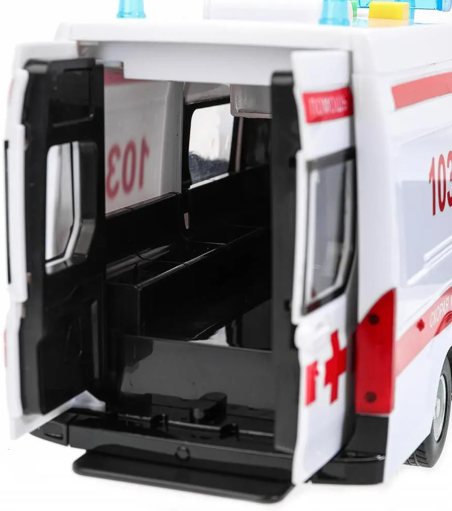 С этой машинкой скорой помощи ребенок почувствует себя настоящим спасателем, ведь в комплекте есть носилки! Благодаря открывающимся дверям, которые делают машинку максимально похожей на настоящую, всегда можно заглянуть к ней внутрь, чтобы убедиться — каждая деталь отлично проработана. Реалистичный дизайн игрушки со звуковыми и световыми эффектами позволят с головой погрузиться в игру, придумывая все новые и новые сюжеты. Игра с инерционной машинкой тренирует координацию движений, внимание, ловкость, знакомит ребёнка с видами транспорта. |