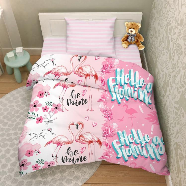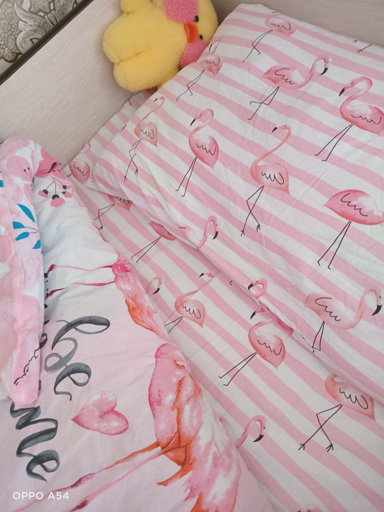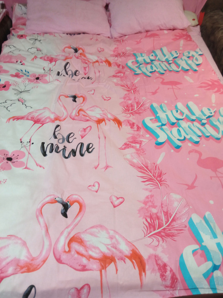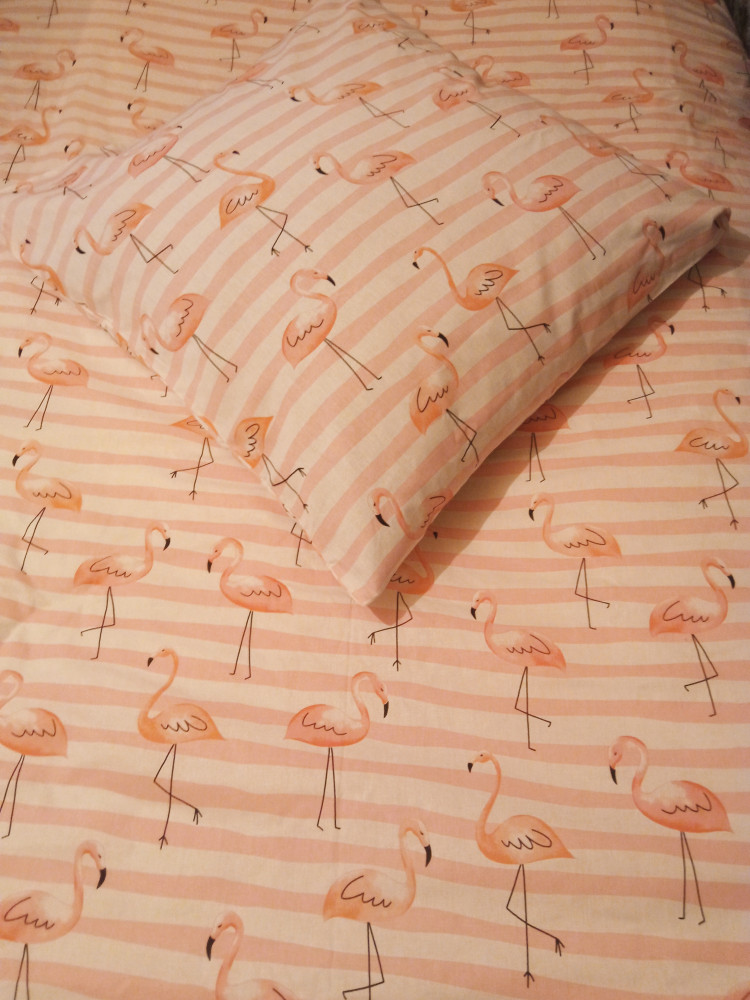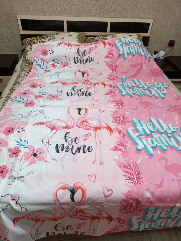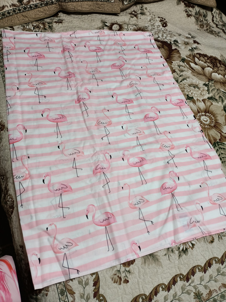 Отличный комплект! Ткань мягкая, расцветка очень красивая. Простынь с наволочкой одинаковые, в полоску с изображением фламинго.