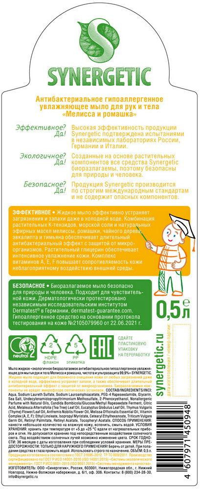 Synergetic Мыло жидкое для мытья рук и тела «Мелисса и ромашка»