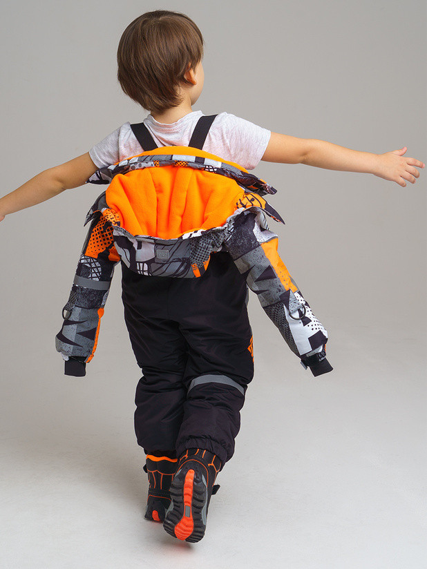 Зимний комбинезон из прочной мембранной ткани — оптимальный вариант для холодной зимы. Наполнитель — синтепон. Водоотталкивающий, ветронепроницаемый и грязеотталкивающий материал. Мягкая подкладка из флиса, безопасный, съемный капюшон, регулируемый шнурком со стопперами, внутренние эластичные лямки, внутренняя и внешняя ветрозащитные планки. Эластичная резинка по низу рукава, внутренний эластичный манжет в рукавах, усиление ткани в области коленей, два боковых кармана и один внутренний карман из эластичной сетки. Шлевка на рукаве для пристегивания варежек, текстильный клапан для защиты подбородка при застегивании молнии, светоотражающие элементы. Регулировка ширины низа брюк при помощи эластичной резинки, съёмные штрипки на брючинах.