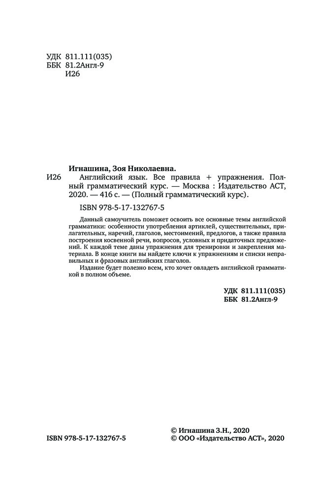 Английский язык. Все правила и упражнения. Полный грамматический курсВ данный момент этот товар отсутствует в продаже. Возможно, у нас найдется аналогичный или похожий товар здесь. Серия: Полный грамматический курс Данный самоучитель поможет освоить все основные темы английской грамматики: особенности употребления артиклей, существительных, прилагательных, наречий, глаголов, местоимений, предлогов, а также правила построения косвенной речи, вопросов, условных и придаточных предложений. К каждой теме даны упражнения для тренировки и закрепления материала. В конце книги вы найдете ключи к упражнениям и списки неправильных и фразовых английских глаголов. |