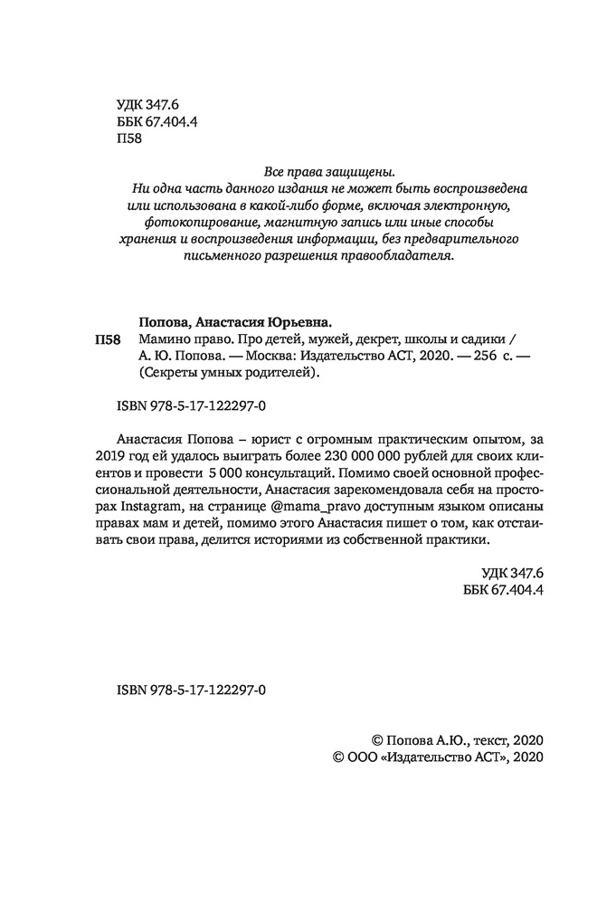 💳 Оплатить за товар можно при получении 🇰🇿 Есть бесплатная доставка по Казахстану 🎁 Копите бонусы с каждой покупки Серия: Секреты умных родителей Анастасия Попова — юрист с огромным практическим опытом, за 2019 год ей удалось выиграть более 230 000 000 рублей для своих клиентов и провести 5 000 консультаций. Помимо своей основной профессиональной деятельности, Анастасия зарекомендовала себя на просторах Instagram, на странице @mama_pravo доступным языком описаны права мам и детей, помимо этого Анастасия пишет о том, как отстаивать свои права, делится историями из собственной практики. |