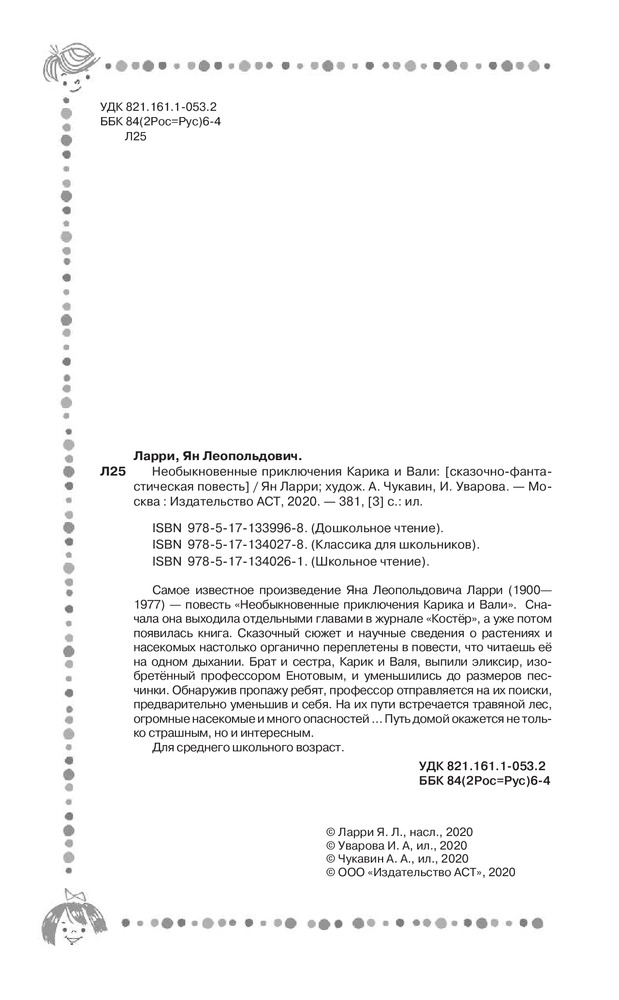 💳 Оплатить за товар можно при получении 🇰🇿 Есть бесплатная доставка по Казахстану 🎁 Копите бонусы с каждой покупки Серия: Школьное чтение Мечта стать маленьким и увидеть мир глазами крошечного существа во все времена владела детьми с воображением. Стоит вспомнить хотя бы Алису в Стране чудес. Карику и Вале повезло — они уменьшились. А вот насколько трудно им пришлось в огромном мире обыкновенной лужайки, вы узнаете, прочитав прекрасную фантастическую повесть Яна Ларри. |