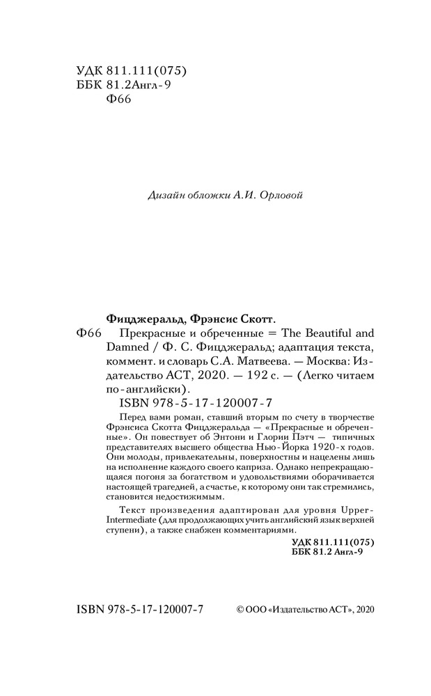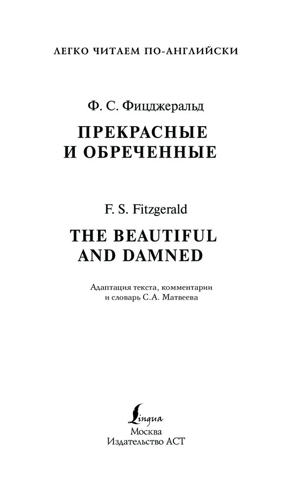 💳 Оплатить за товар можно при получении 🇰🇿 Есть бесплатная доставка по Казахстану от 1 дня 🎁 Копите бонусы с каждой покупки Серия: Легко читаем по-английски Перед вами роман, ставший вторым по счету в творчестве Фрэнсиса Скотта Фицджеральда — «Прекрасные и обреченные». Он повествует об Энтони и Глории Пэтч — типичных представителях высшего общества Нью-Йорка 1920-х годов. Они молоды, привлекательны, поверхностны и нацелены лишь на исполнение каждого своего каприза. Однако непрекращающаяся погоня за богатством и удовольствиями оборачивается настоящей трагедией, а счастье, к которому они так стремились, становится недостижимым. |