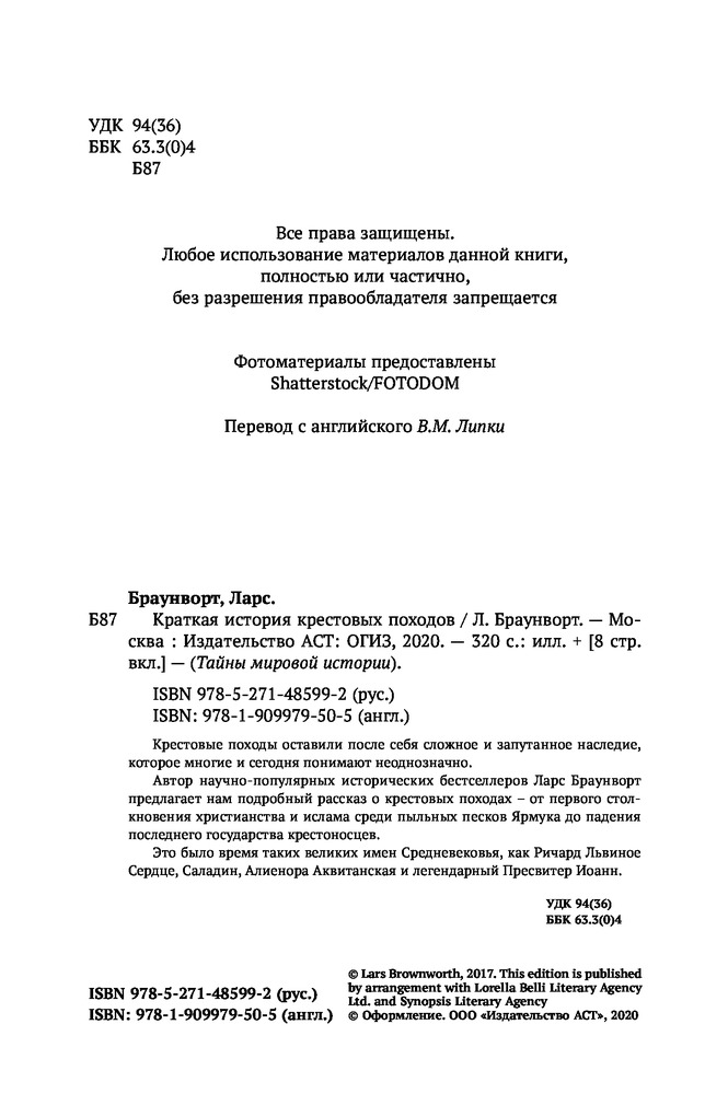 Автор научно-популярных исторических бестселлеров Ларс Браунворт предлагает нам подробный рассказ о крестовых походах — от первого столкновения христианства и ислама среди пыльных песков Ярмука до падения последнего государства крестоносцев.