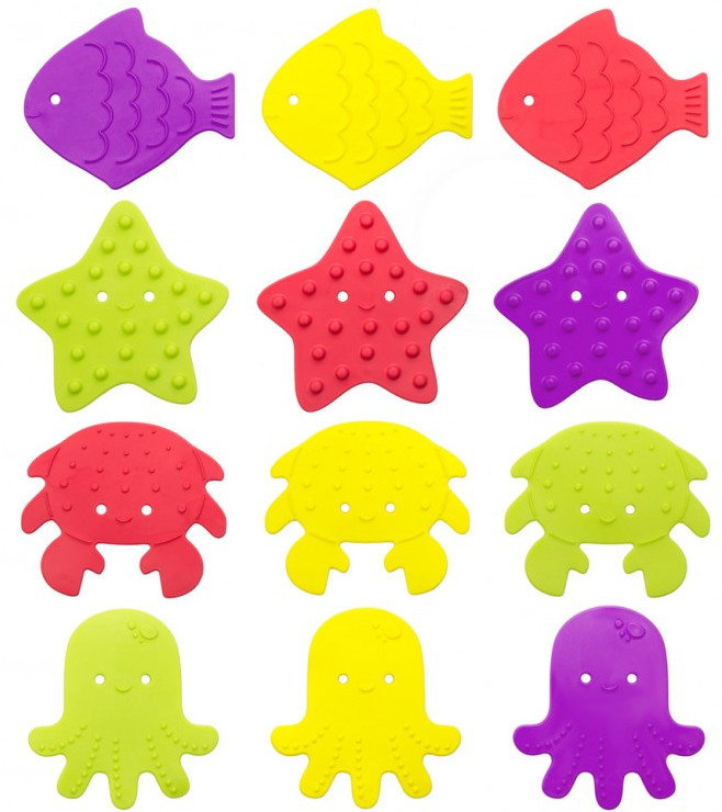 Мало того, что это тренажер для развития мелкой моторики и хватательных рефлексов, с мини-ковриками ваш малыш познакомится с названиями морских обитателей и выучит основные цвета. Налепите коврики на дно и стенки ванны, на кафель или даже на пол, чтобы не только обеспечить удобство, но и расставить яркие цветовые акценты!
