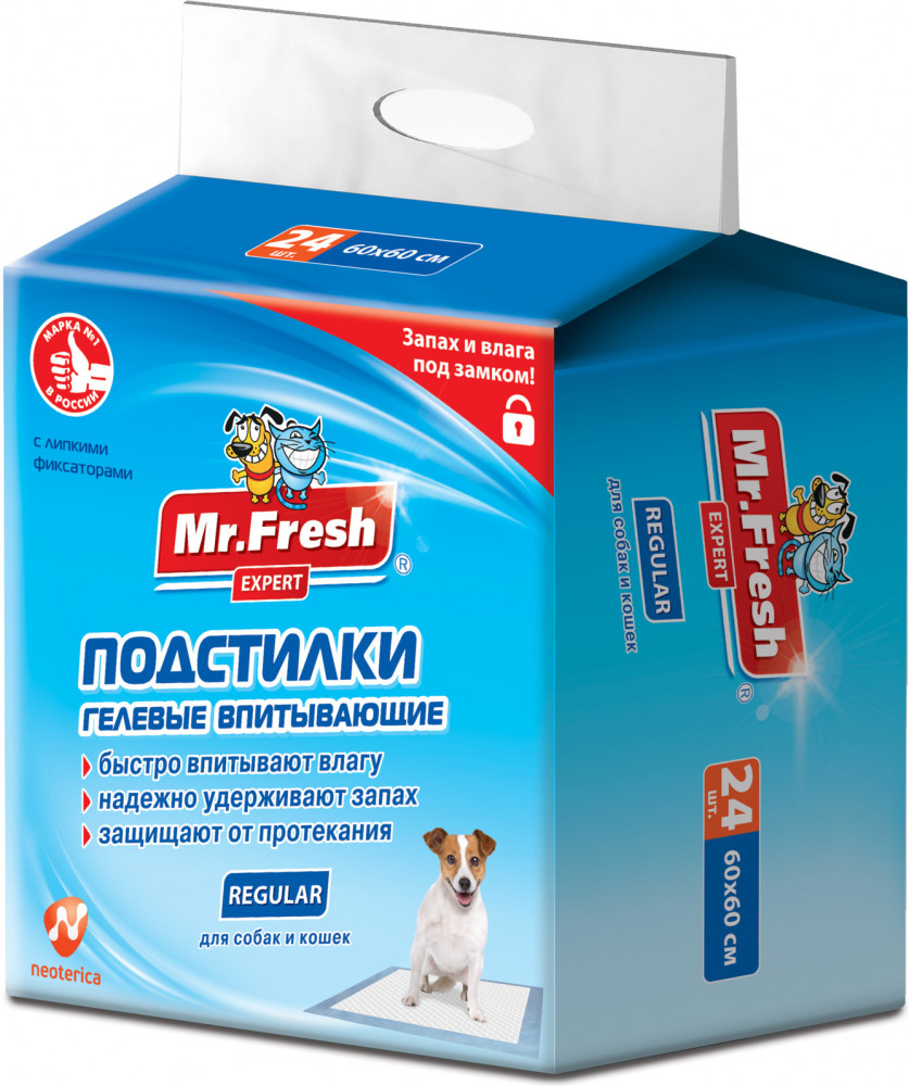 Mr.Fresh Expert Подстилки гелевые для собак и кошекВ данный момент этот товар отсутствует в продаже. Возможно, у нас найдется аналогичный или похожий товар здесь. «Fresh Regular» — гелевые подстилки повышенной впитываемости: — специальная пористая структура подстилки за секунды впитывает влагу; — суперабсорбент превращает влагу в гель, защищая от протеканий и обеспечивая сухость; — система «odor blocker» удерживает неприятные запахи; — липкие фиксаторы удерживают подстилку на месте во время «закапывания туалета». |