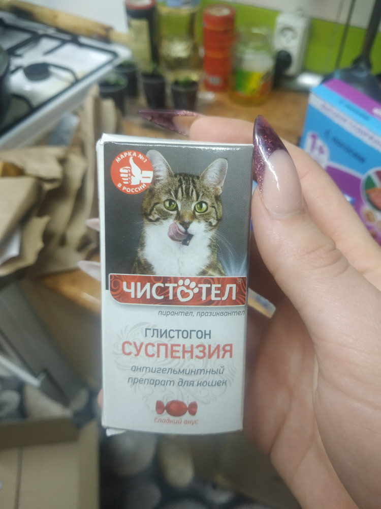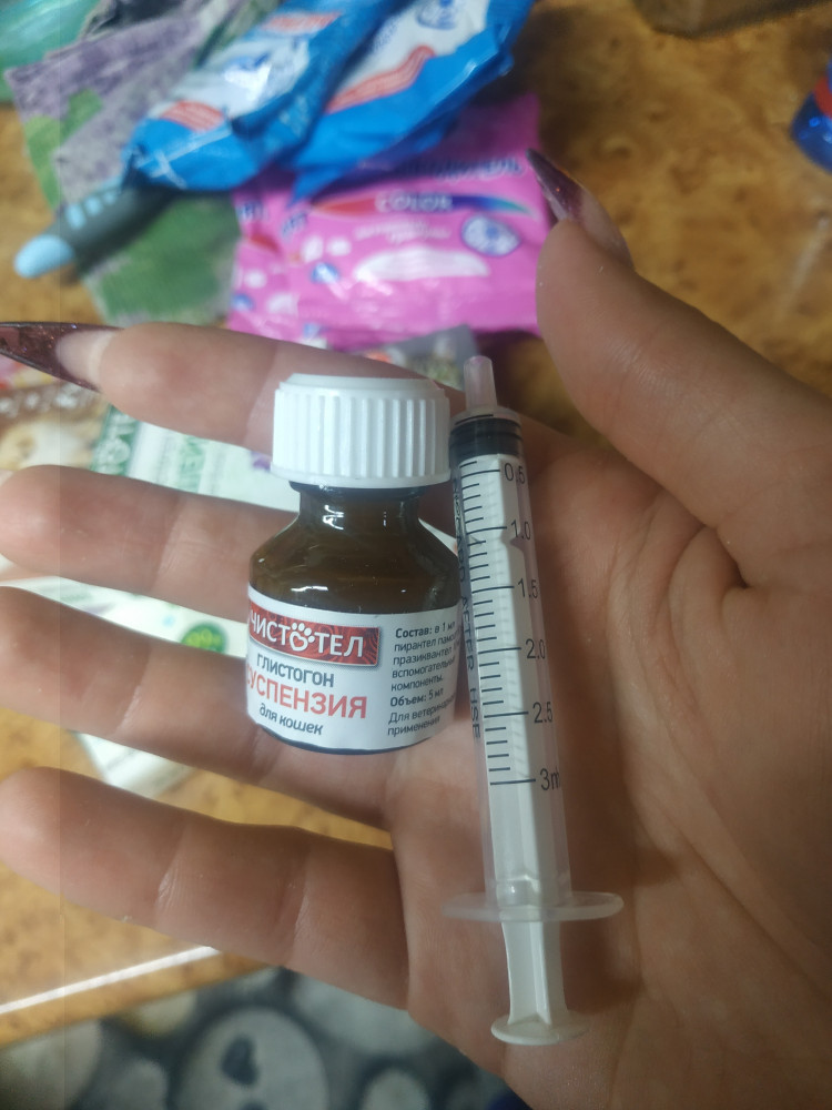 хорошее глистогонное,удаляет паразитов с первой процедуры. в комплекте шприц,удобно при лечении питомца