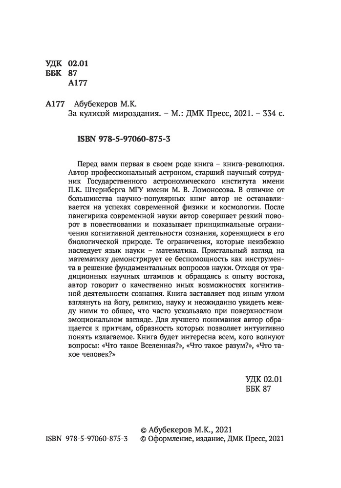 💳 Оплатить за товар можно при получении 🇰🇿 Есть бесплатная доставка по Казахстану от 1 дня 🎁 Копите бонусы с каждой покупки Перед вами уникальная книга-размышление о Вселенной, науке и религии. Автор — профессиональный астроном, старший научный сотрудник Государственного астрономического института имени П.К. Штернберга МГУ имени М. В. Ломоносова. В отличие от большинства научно-популярных изданий, эта книга не ограничивается рассказом об успехах современной физики и космологии. После панегирика современной науке автор совершает резкий поворот в повествовании и показывает принципиальные ограничения когнитивной деятельности сознания, коренящиеся в его биологической природе. Те ограничения, которые неизбежно наследует язык науки, математика. Пристальный взгляд на математику демонстрирует ее беспомощность как инструмента в решении фундаментальных вопросов науки. |