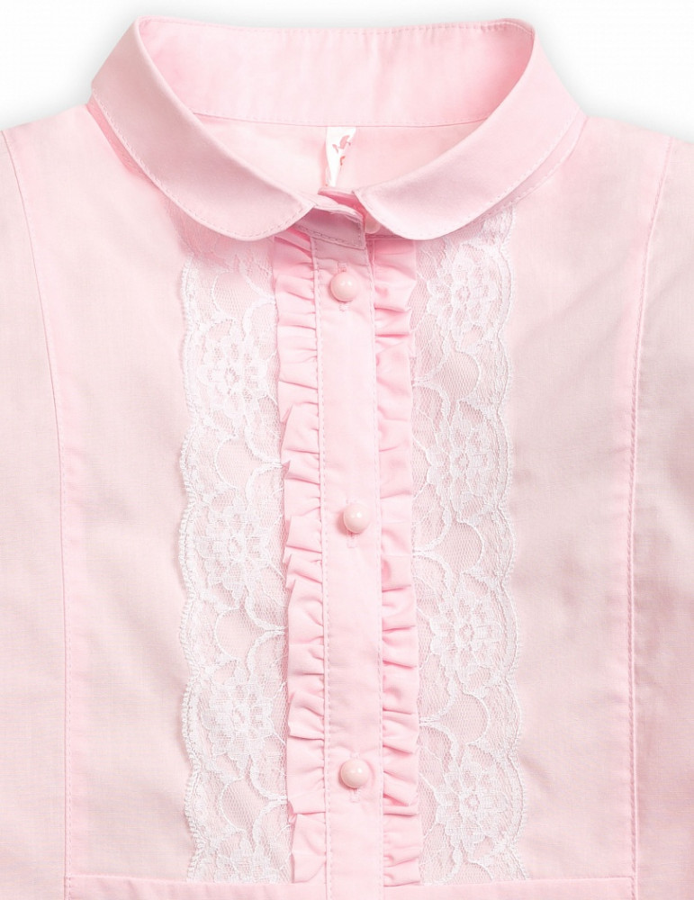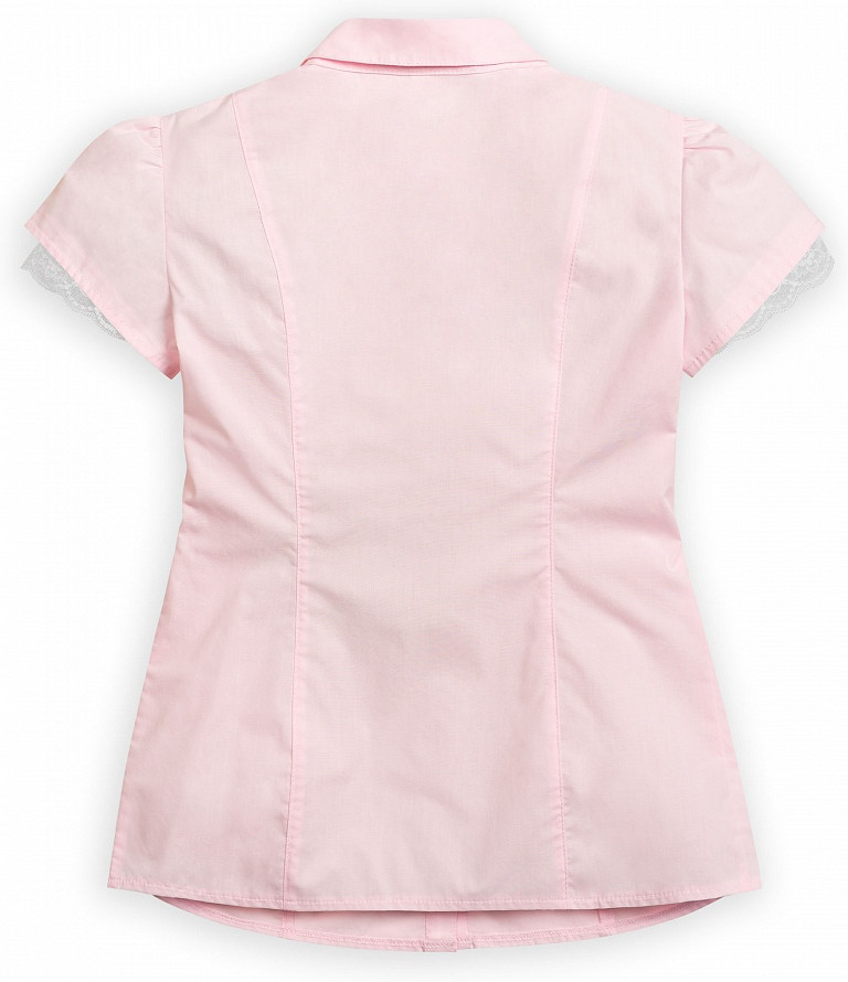 Блузка для девочек с коротким рукавом. Классическая блузка полуприлегающего силуэта с рельефами по переду и спинке. Кружево вдоль планки, изящный воротничок на стойке. Двойной рукав. Верхний слой выполнен из основной ткани, нижний слой из сетки и кружева.