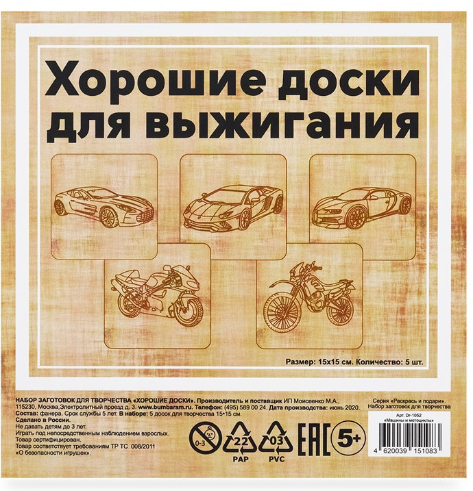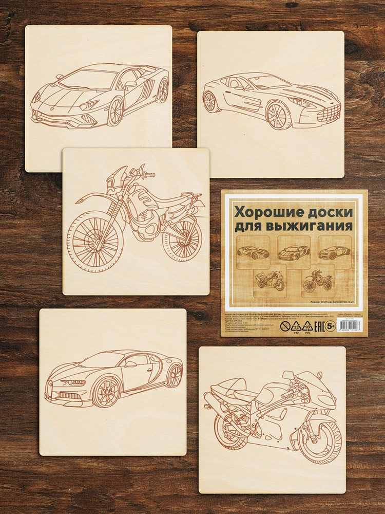 Набор из 5 деревянных заготовок подойдет для выжигания или раскрашивания. На каждую из досок нанесены контурные изображения. Доски выполнены из качественной березовой фанеры. Поверхность отлично отшлифована, ровная, без шероховатостей и зазубрин.