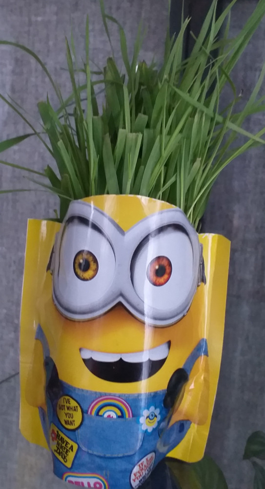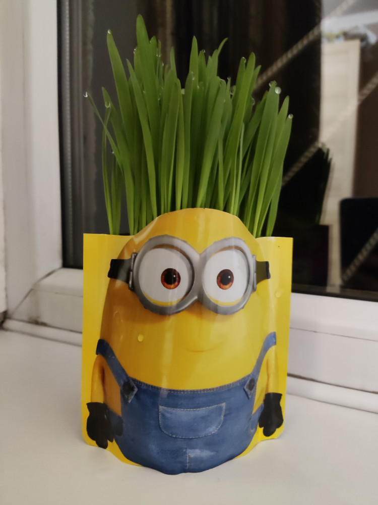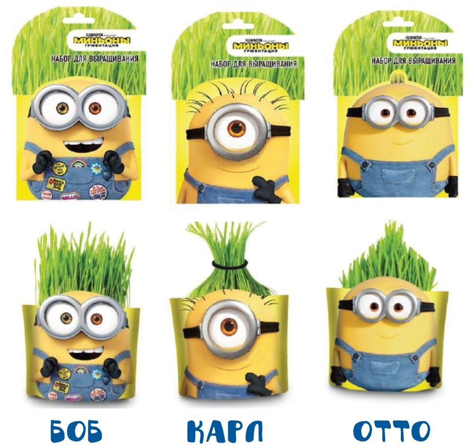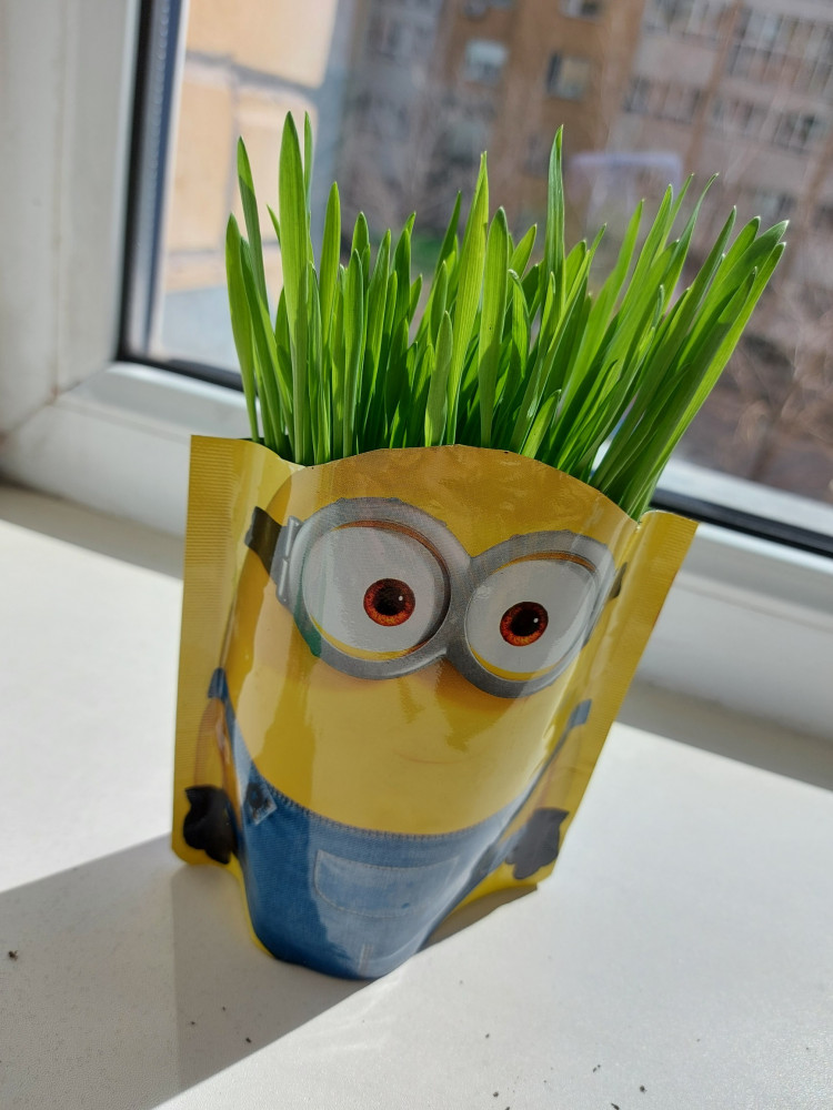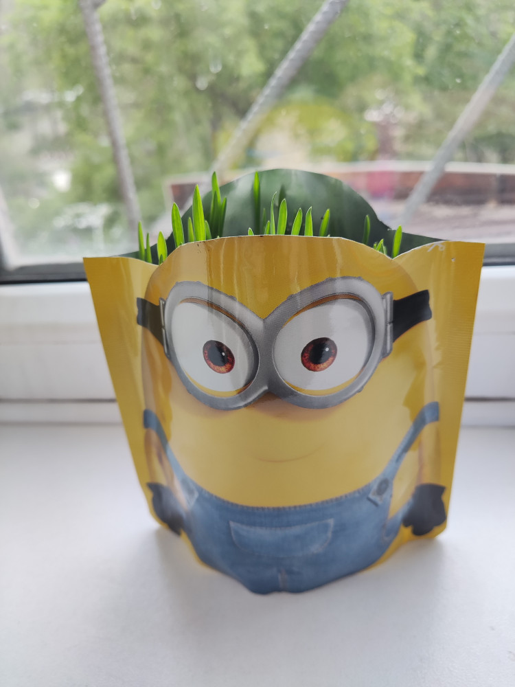 Классный Миньон! Дочке 2 года, ей очень понравилось внешнее оформление. Пакетик очень яркий! Дочка с удовольствием принимала участие в посадке травы. Травка растет очень быстро!!! Фото через 4 дня после посадки и через неделю.