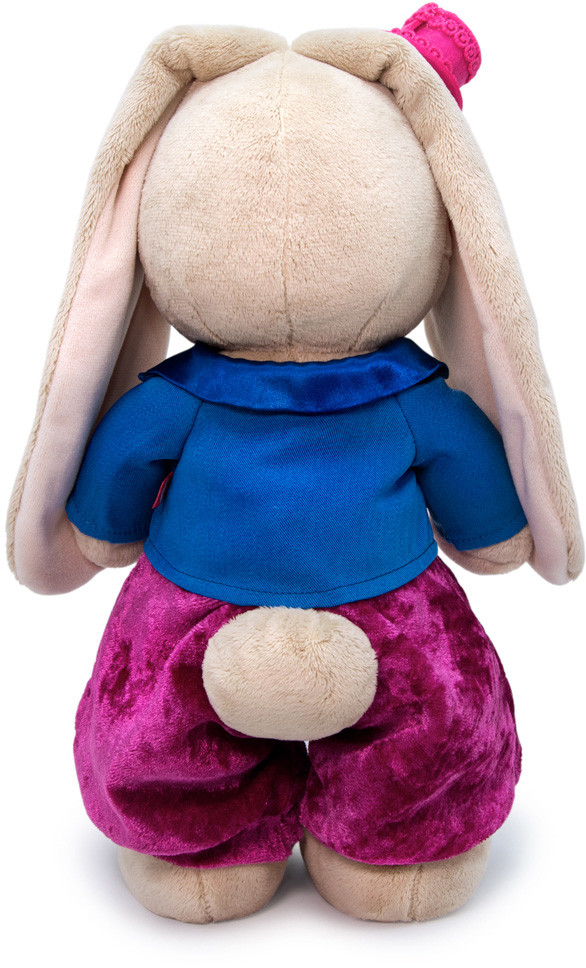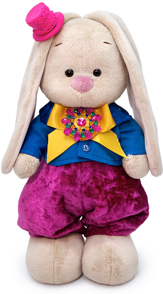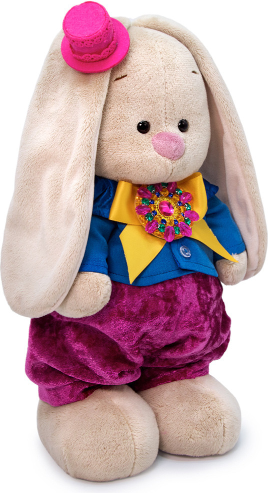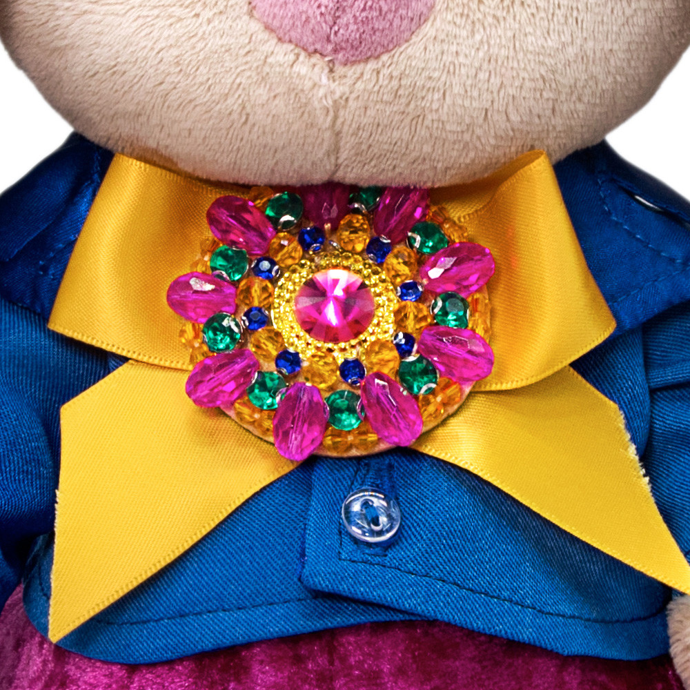 Зайка в образе кавалера в обворожительном комплекте. Нарядные бархатные штанишки пурпурно-маджентового цвета. Укороченный пиджачок из костюмной ткани ослепительно синего цвета, с атласной отделкой по лацканам. В комплекте очень симпатичная яркая шляпка из фетра, отделанная кружевом в тон. Также в комплекте шикарная брошь ручной работы, на атласной широкой ленте сияющего желтого цвета.