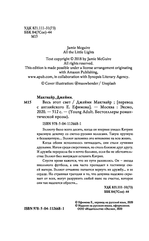 Весь этот светВ данный момент этот товар отсутствует в продаже. Возможно, у нас найдется аналогичный или похожий товар здесь. Серия: Young Adult. Бестселлеры романтической прозы Эллиоту было всего десять, когда он впервые увидел Кэтрин: красивую девочку со светло-русыми волосами. Такую хрупкую и беззащитную... Эллиот запомнил это мгновение на всю жизнь. |