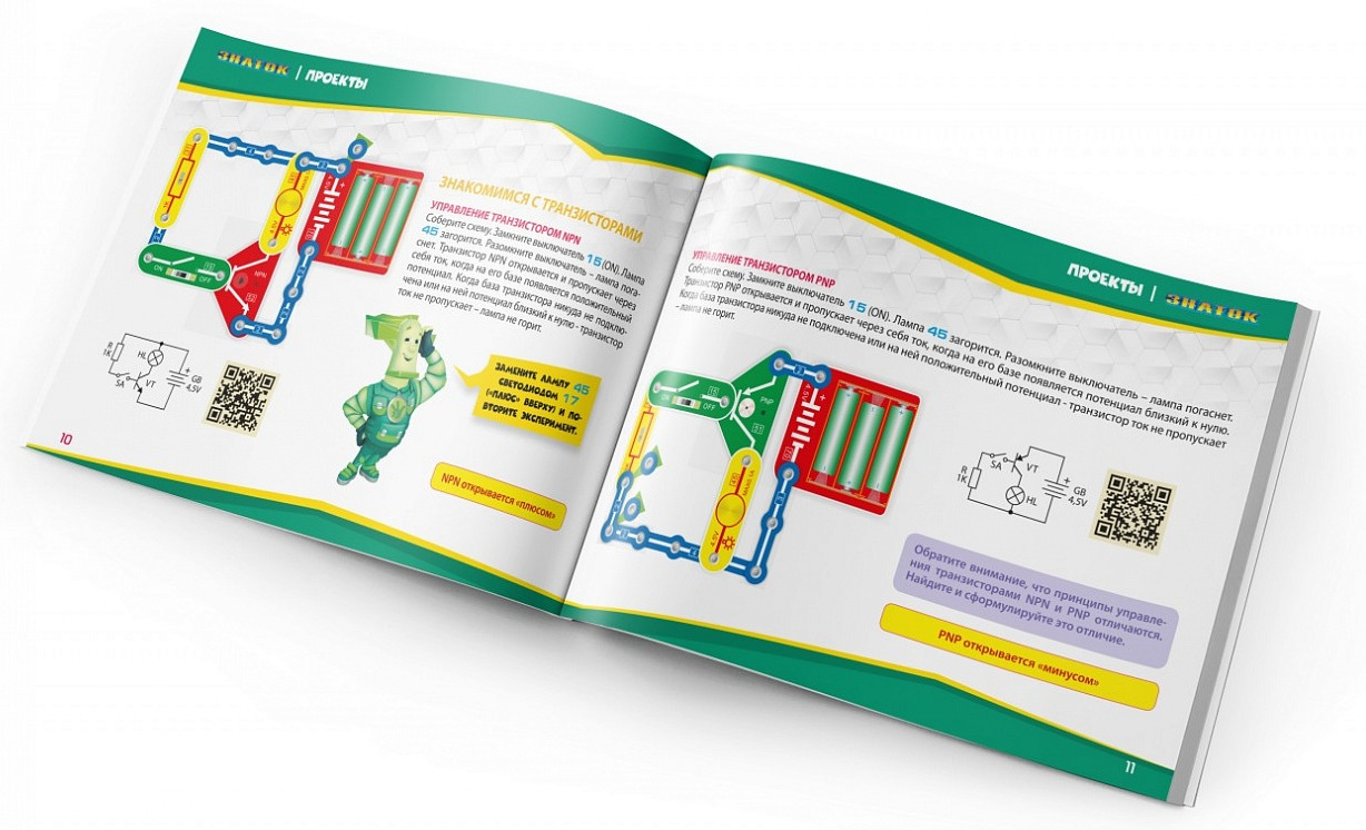 Даже без помощи взрослых, используя очень понятное цветное руководство, всего за несколько минут дети смогут собрать и испытать схему с практически 100% положительным результатом.