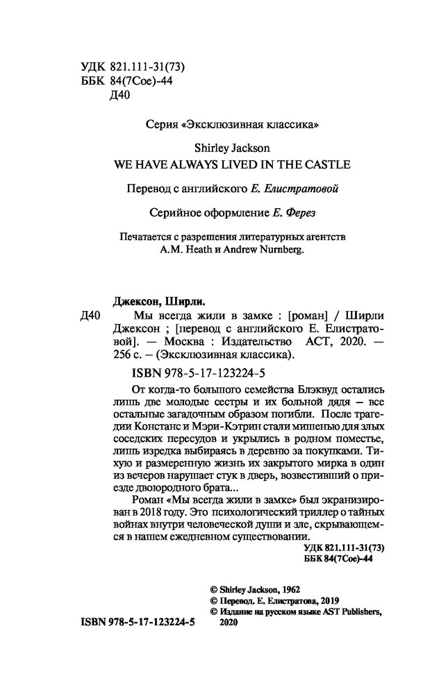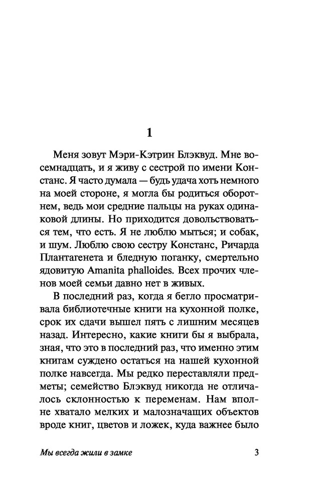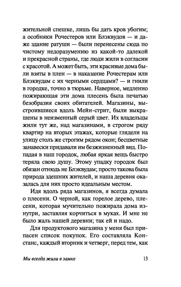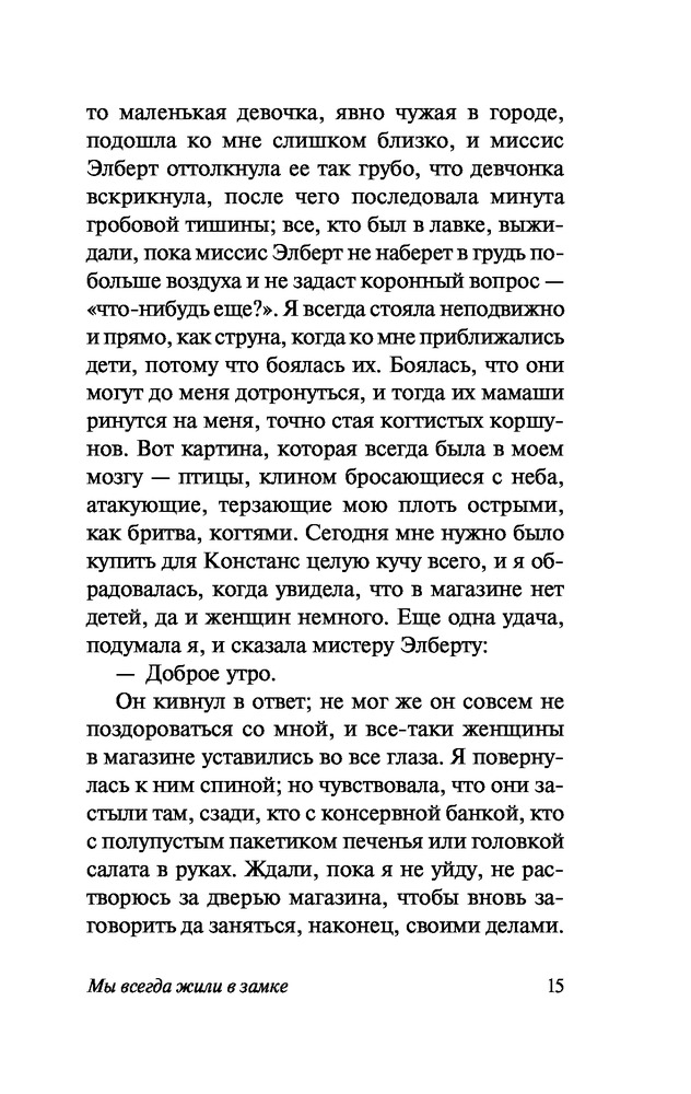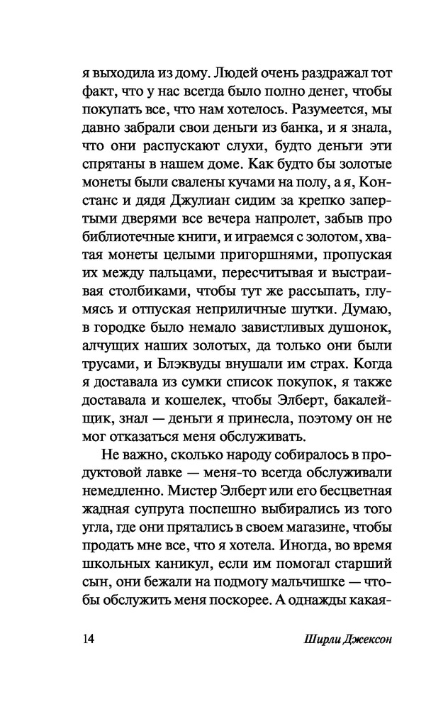 Мы всегда жили в замкезахватывающий сюжет колоритные персонажи комфортный шрифт В данный момент этот товар отсутствует в продаже. Возможно, у нас найдется аналогичный или похожий товар здесь. Серия: Эксклюзивная классика От когда-то большого семейства Блэквуд остались лишь две молодые сестры и их больной дядя — все остальные загадочным образом погибли. После трагедии Констанс и Мэри-Кэтрин стали мишенью для злых соседских пересудов и укрылись в родном поместье, лишь изредка выбираясь в деревню за покупками. Тихую и размеренную жизнь их закрытого мирка в один из вечеров нарушает стук в дверь, возвестивший о приезде двоюродного брата... |