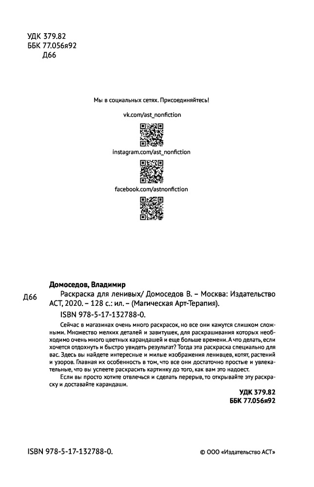 Раскраска для ленивыхВ данный момент этот товар отсутствует в продаже. Возможно, у нас найдется аналогичный или похожий товар здесь. Серия: Магическая Арт-Терапия Сейчас в магазинах очень много раскрасок, но все они кажутся слишком сложными. Множество мелких деталей и завитушек, для раскрашивания которых необходимо очень много цветных карандашей и еще больше времени. А что делать, если хочется отдохнуть и быстро увидеть результат? Тогда эта раскраска специально для вас. Здесь вы найдете интересные и милые изображения ленивцев, котят, растений и узоров. Главная их особенность в том, что все они достаточно простые и увлекательные, что вы успеете раскрасить картинку до того, как вам это надоест. |