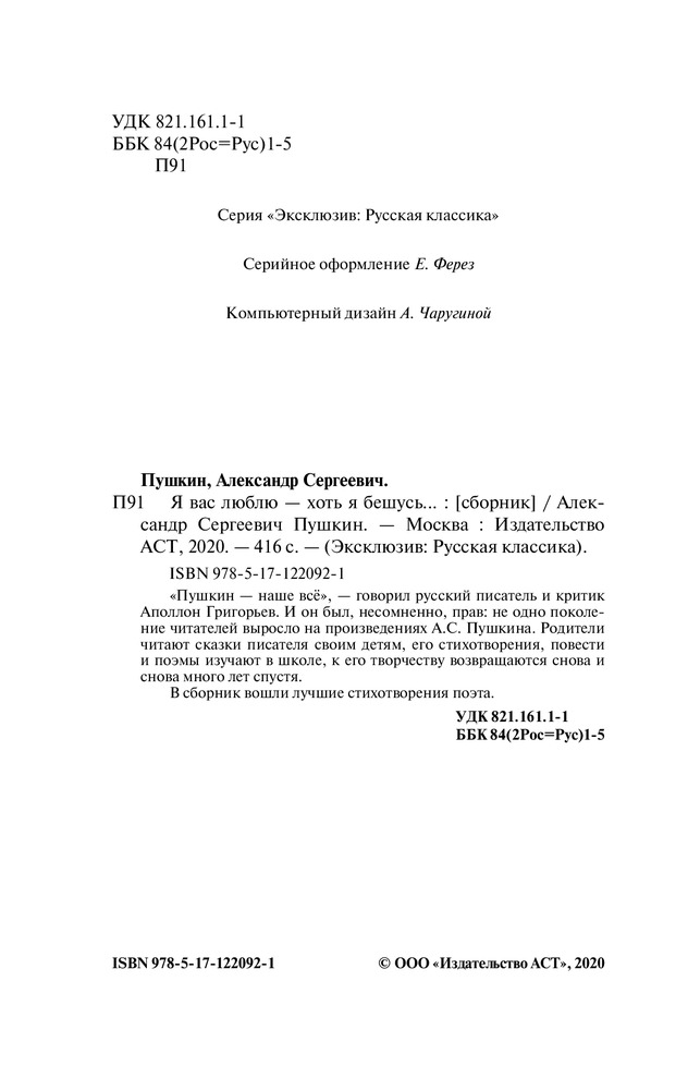 💳 Оплатить за товар можно при получении 🇰🇿 Есть бесплатная доставка по Казахстану от 1 дня 🎁 Копите бонусы с каждой покупки Серия: Эксклюзив: Русская классика «Пушкин — наше всё», — говорил русский писатель и критик Аполлон Григорьев. И он был, несомненно, прав: не одно поколение читателей выросло на произведениях А.С. Пушкина. Родители читают сказки писателя своим детям, его стихотворения, повести и поэмы изучают в школе, к его творчеству возвращаются снова и снова много лет спустя. |