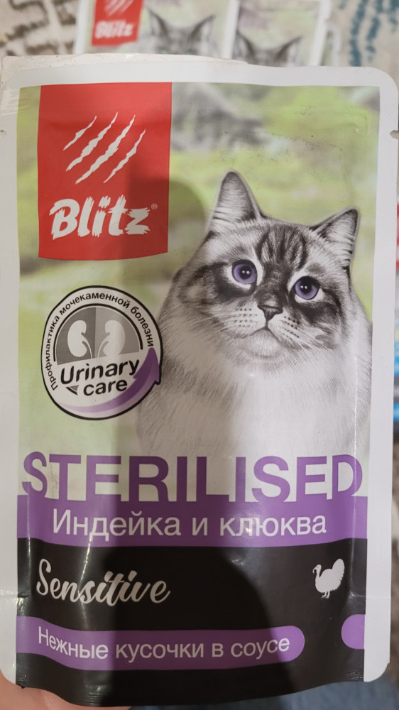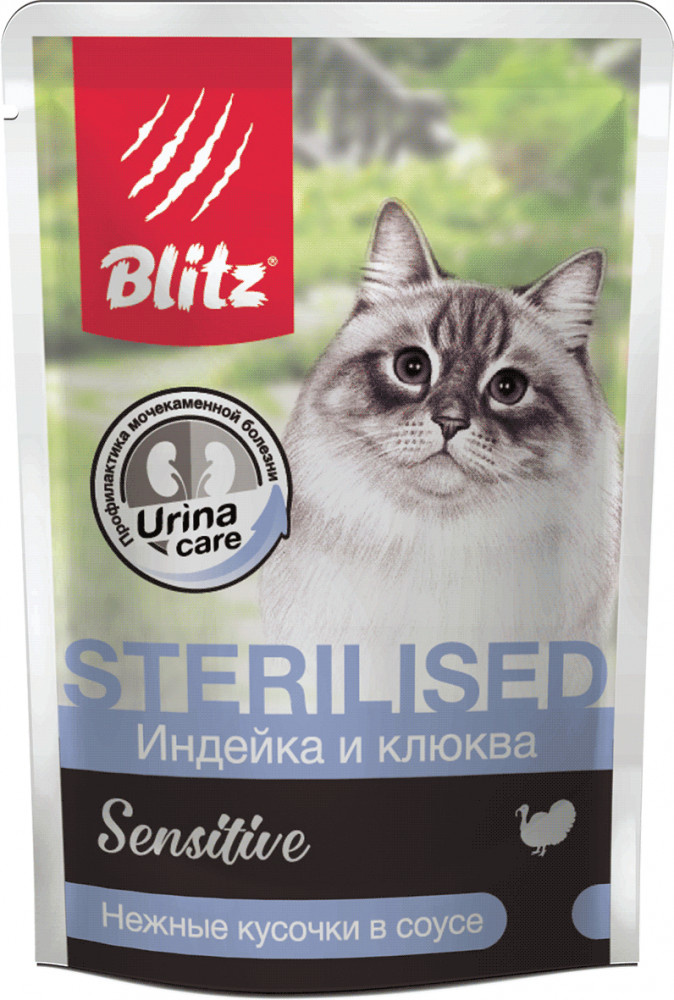 Blitz Корм для стерилизованных кошек и кастрированных котов с индейкой и клюквой-20% +6 аппетитность вкус состав мясное содержание высокое качество