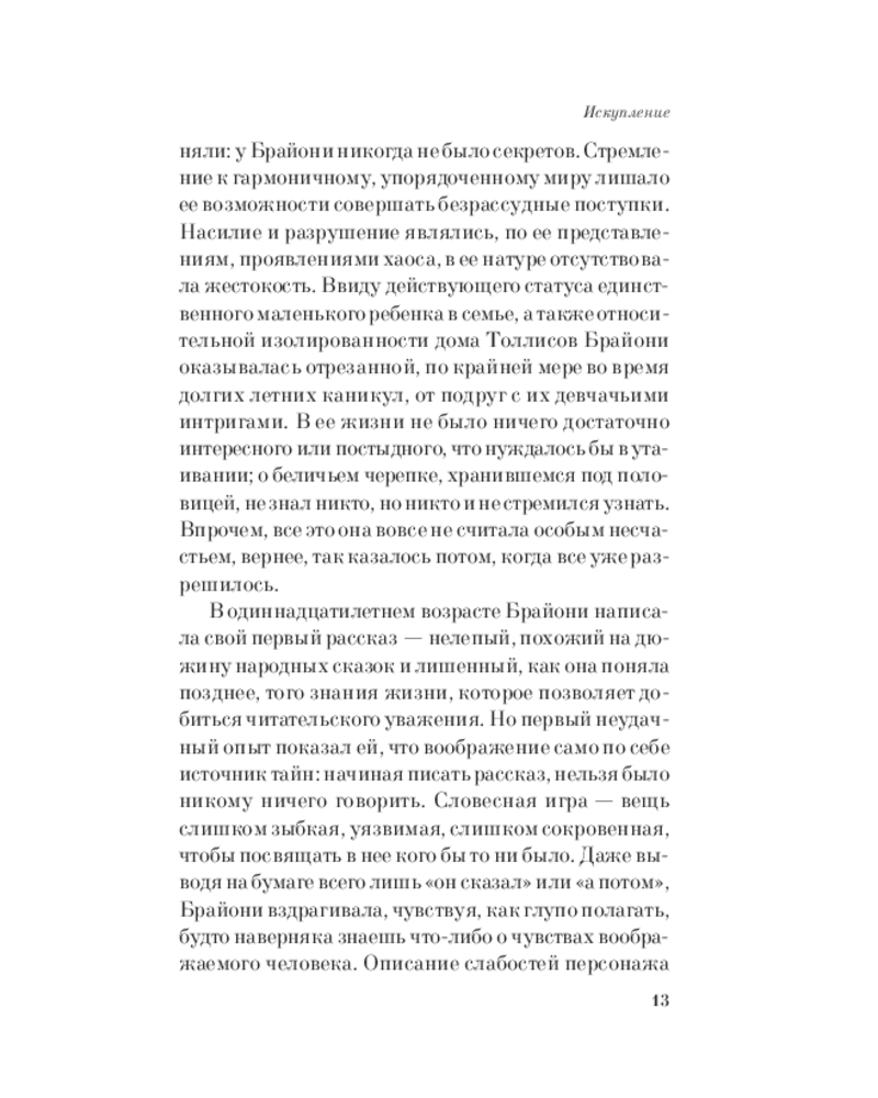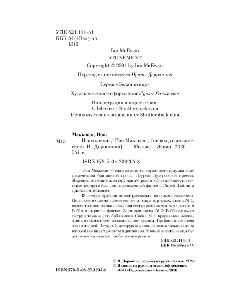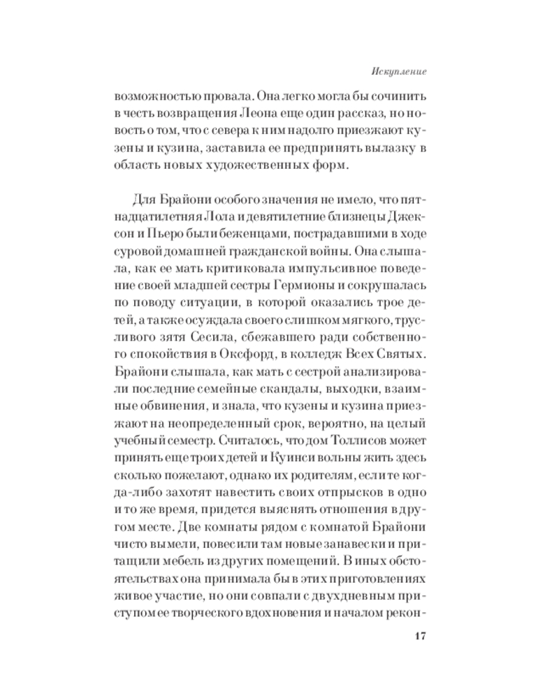 Эту книгу я могу рекомендовал смело. Сколько людей, столько и мнений. Автор даёт возможность увидеть одну ситуацию под с разных точек зрения. Всего одно событие и столько сломанных судеб. Иэн Макьюн сумел рассказать эту историю с такой эмоциональстью, что она не оставила меня равнодушной. Советую посмотреть одноимённый фильм 2007-ого года. Я думаю, что книга и фильм понравятся многим. Я же продолжу дальше читать книги автора. Благодарю магазин за книги этого автора и многих других.