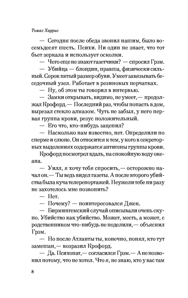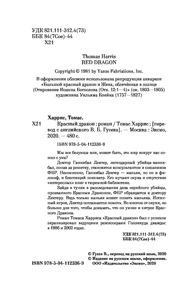 Всё-таки, Томас Харрис это нечто)) Люблю этот фильм, немного переживала что книга будет сильно отличаться, но напрасно. Книга великолепна, рекомендую! Хороший перевод, художественный.