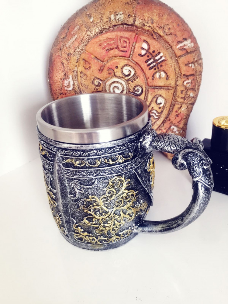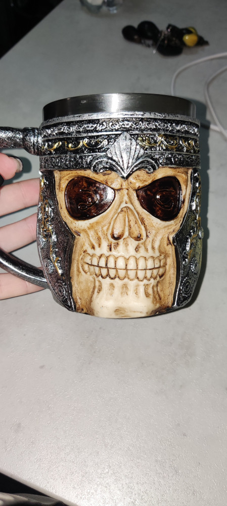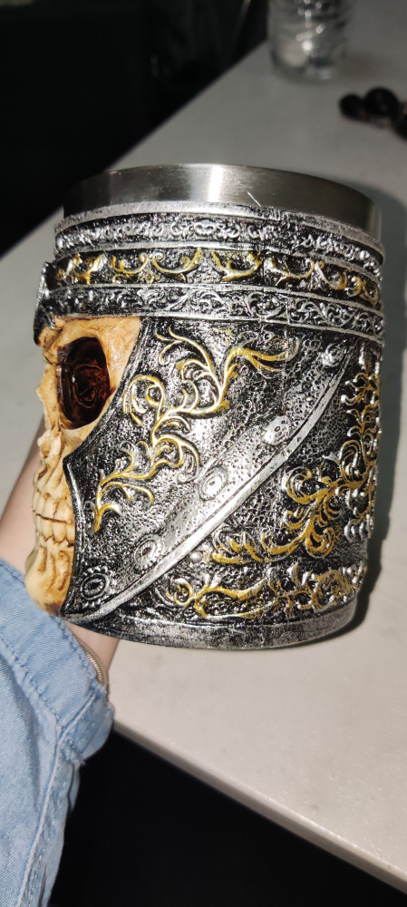 На фото смотрится, конечно, более презентабельно и благородно. В яви выглядит намного дешевле. Хотя, тоже очень неплохо, но больше подходит ребенку. Я же брала на подарок мужчине. Казалось, будет поувесистее, и внутренняя часть из нержавейки качеством получше. Одаренный поулыбался, сказал, что пойдёт. Блестящий рисунок не бронзового оттенка, а ярко золотая краска не совсем аккуратно нанесенная. Череп понравился. Да и кружка смотрелась бы намного лучше без этой позолоты. Доставка, упаковка хорошо.