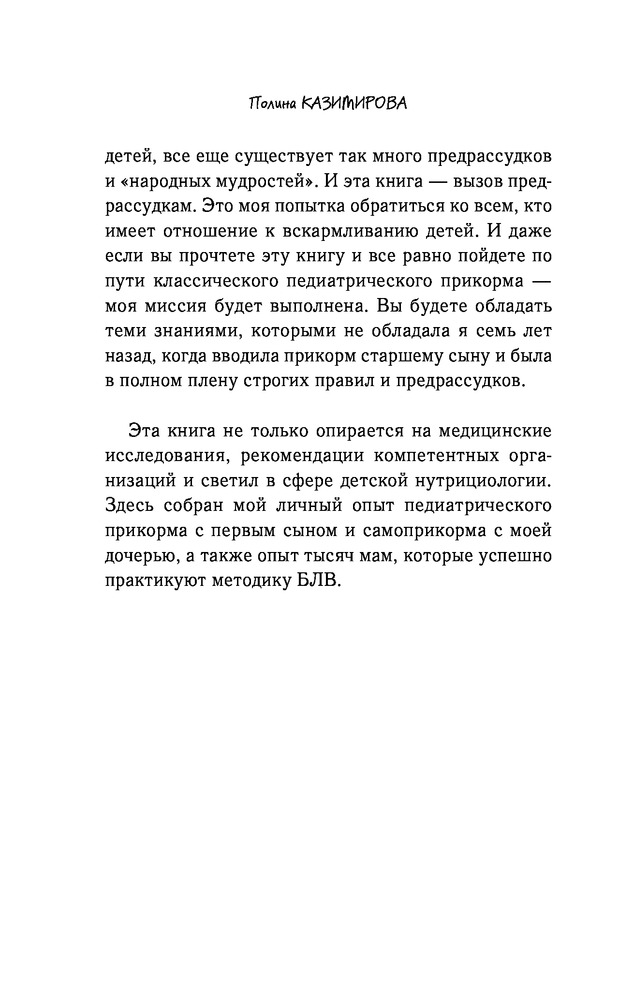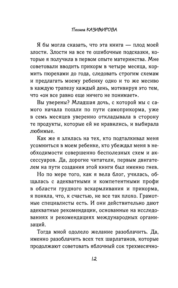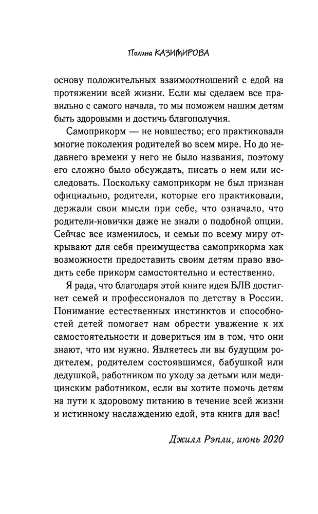 Автор книги — Полина Казимирова — детский нутрициолог, последовательница Джилл Рэпли — доктора наук, впервые описавшего этот метод в 2008 году в своей книге Baby-Led Weaning. Полина живет в Италии, мама двоих детей. Она успешно ввела прикорм своей младшей дочери методом самоприкорма. Автор многочисленных статей о проблемах детского питания, создательница обучающего курса по самоприкорму, основательница и автор проекта «Прикорм с удовольствием».