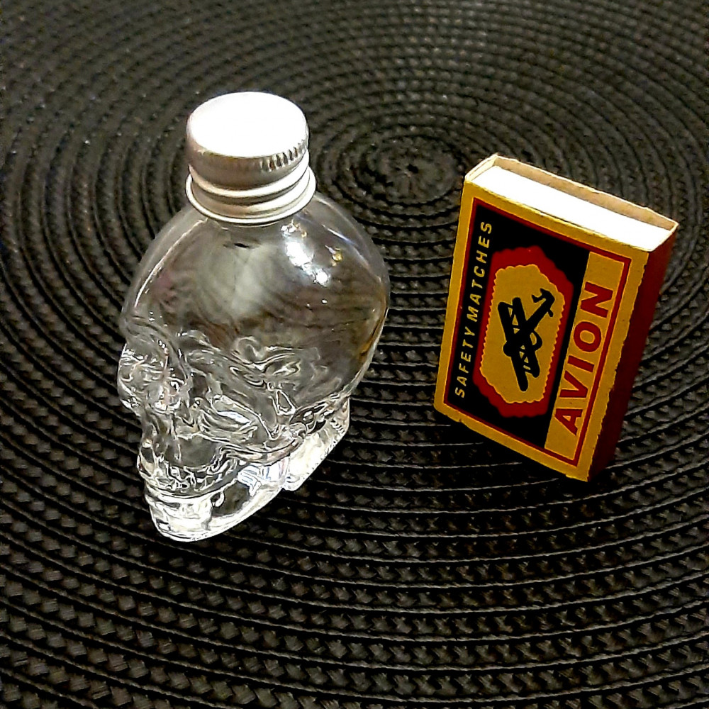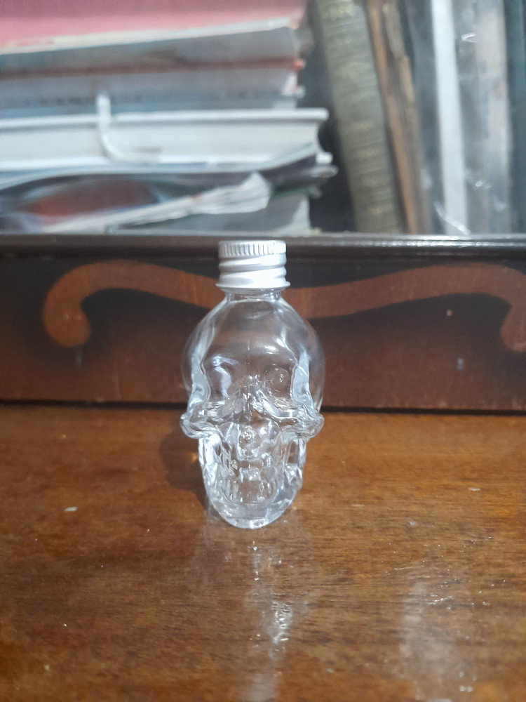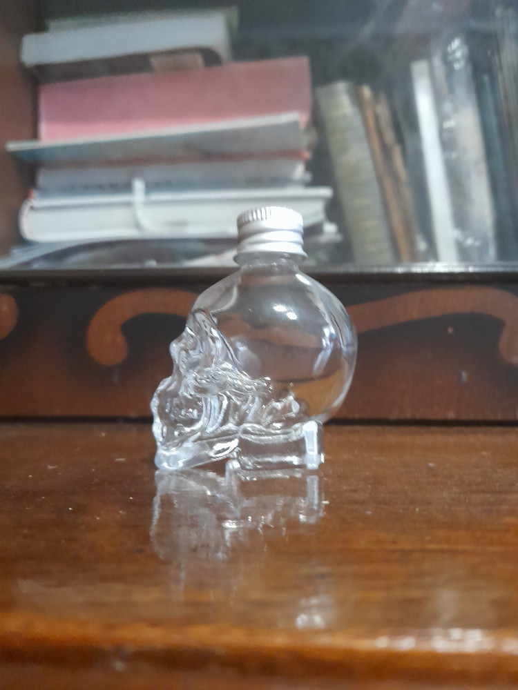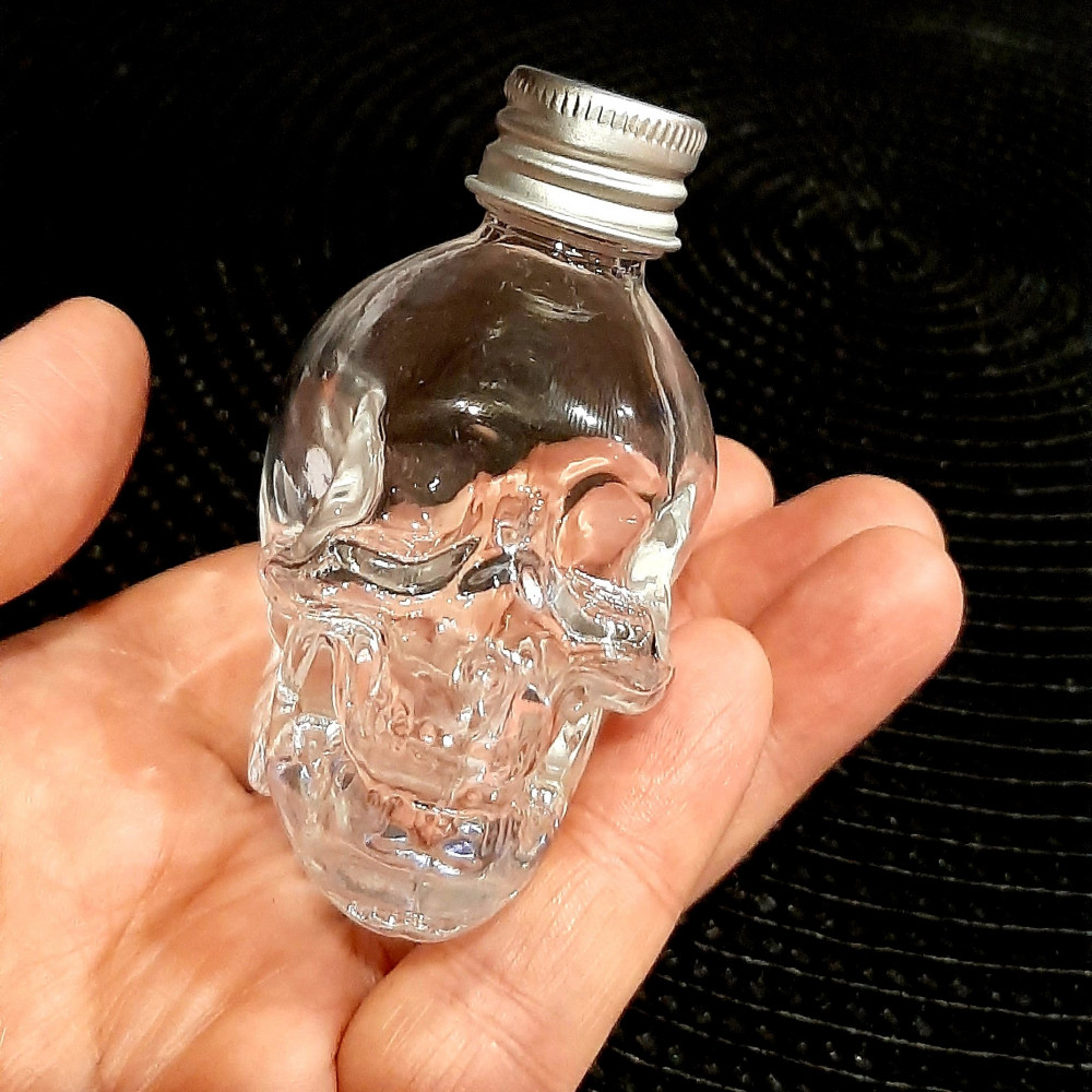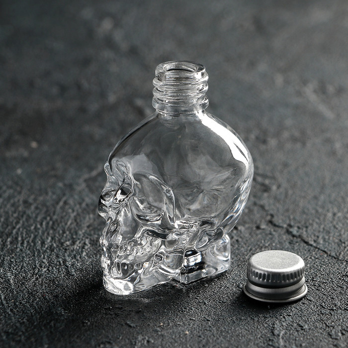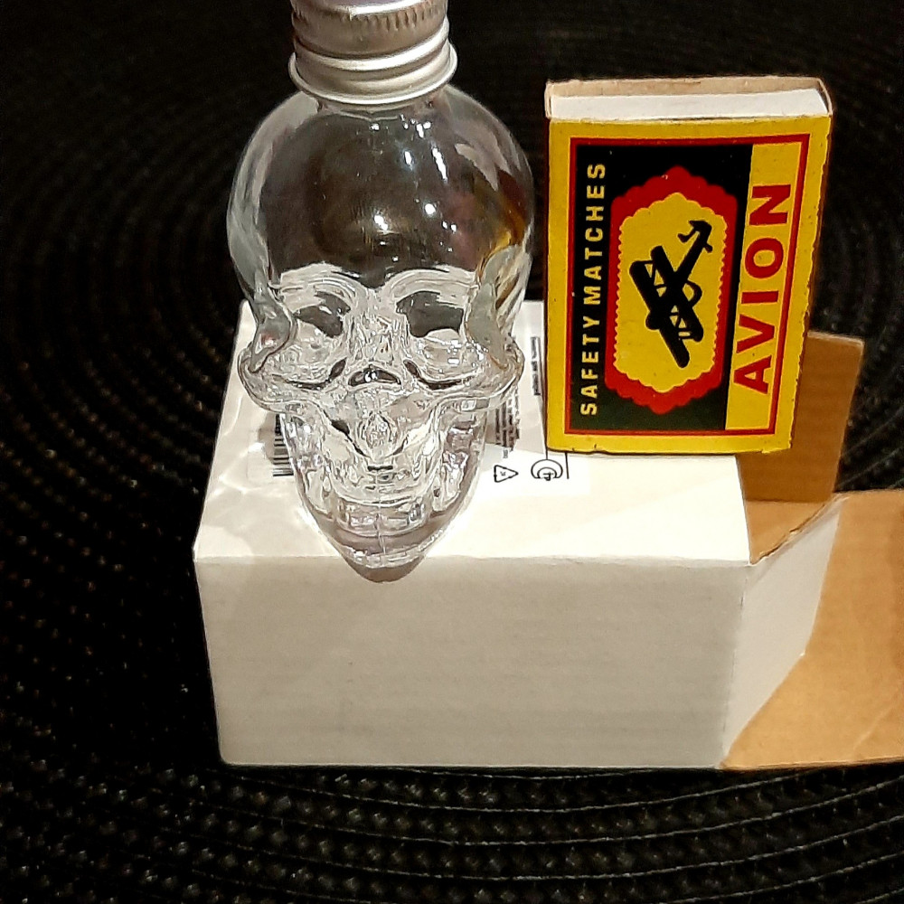 Прозрачное, Нетонкое стекло. Без сколов и царапин.Чёткий оттиск черепа. Жестяная крышечка, хорошо и герметично закручивается. Упакован в картонной белой коробочке.