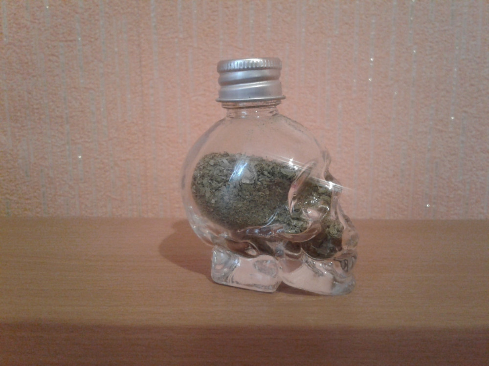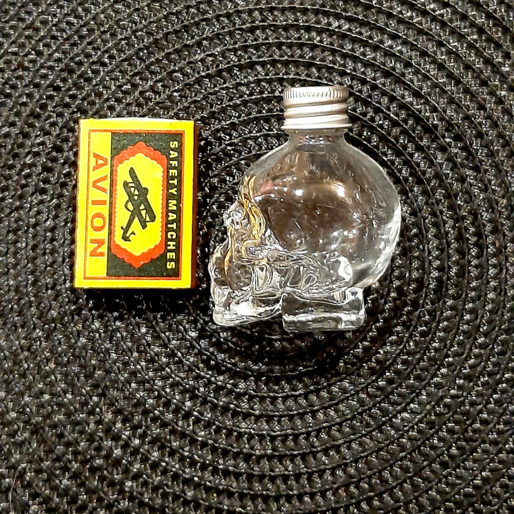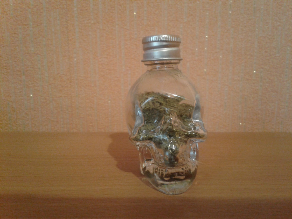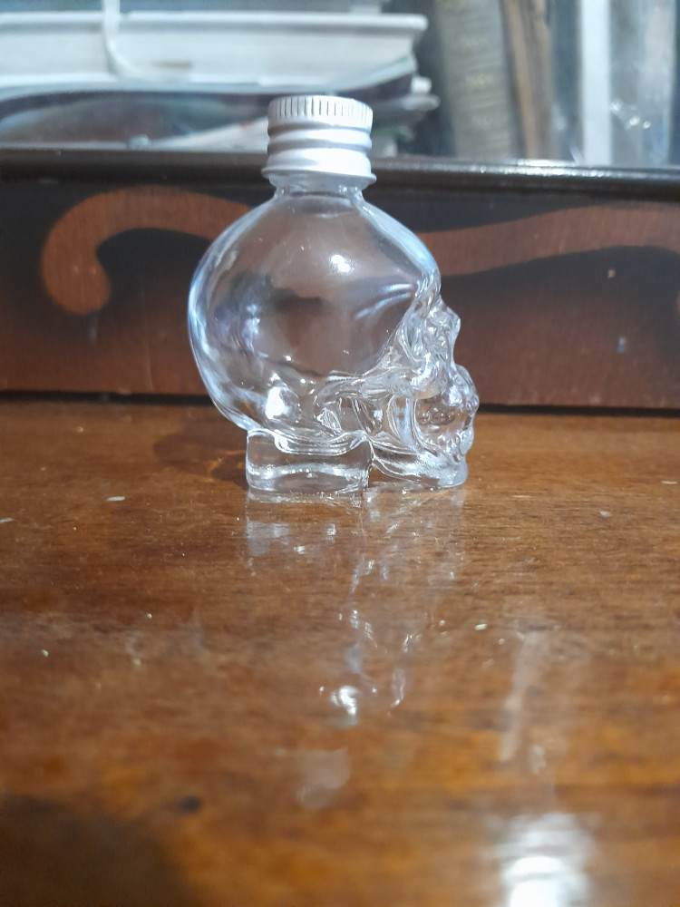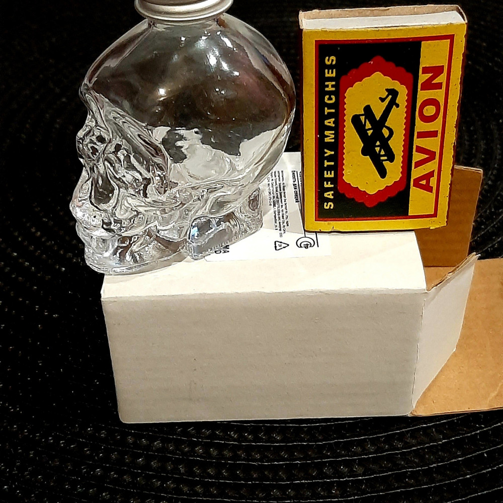 Прозрачное, Нетонкое стекло. Без сколов и царапин.Чёткий оттиск черепа. Жестяная крышечка, хорошо и герметично закручивается. Упакован в картонной белой коробочке.