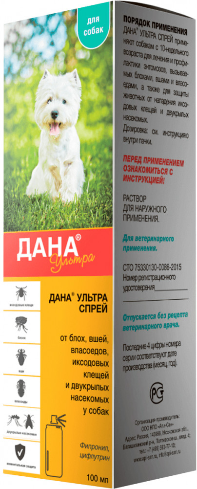 Спрей для собак «Дана Ультра» — спрей для профилактики и борьбы с блохами, вшами, власоедами, клещами и другими насекомыми.