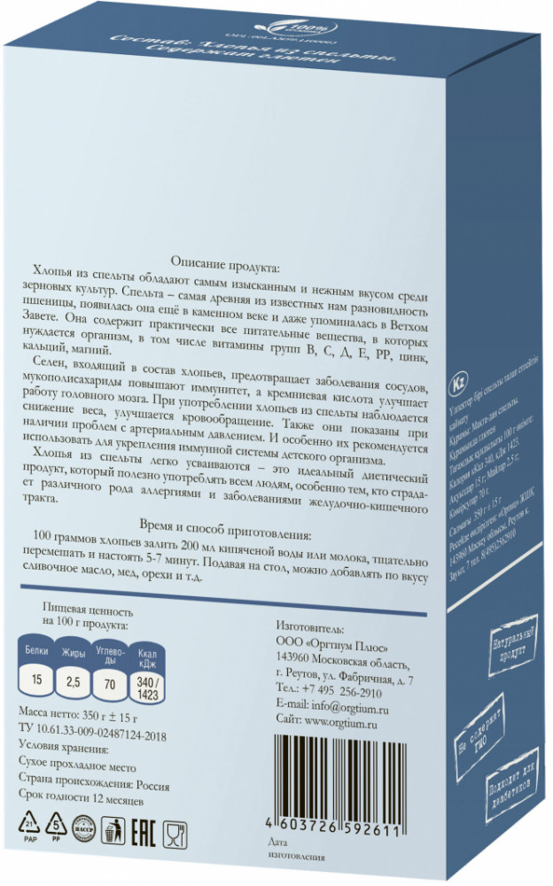Оргтиум Хлопья из спельты без термической обработкиВ данный момент этот товар отсутствует в продаже. Возможно, у нас найдется аналогичный или похожий товар здесь. Хлопья из спельты обладают самым изысканным и нежным вкусом среди зерновых культур. Спельта — самая древняя из известных нам разновидность пшеницы, появилась она ещё в каменном веке и даже упоминалась в Ветхом Завете. Она содержит практически все питательные вещества, в которых нуждается организм, в том числе витамины групп В, С, Д, Е, РР, цинк, кальций, магний. Селен, входящий в состав хлопьев, предотвращает заболевания сосудов, мукополисахариды повышают иммунитет, а кремниевая кислота улучшает работу головного мозга. При употреблении хлопьев из спельты наблюдается снижение веса, улучшается кровообращение. Также они показаны при наличии проблем с артериальным давлением. И особенно их рекомендуется использовать для укрепления иммунной системы детского организма. |