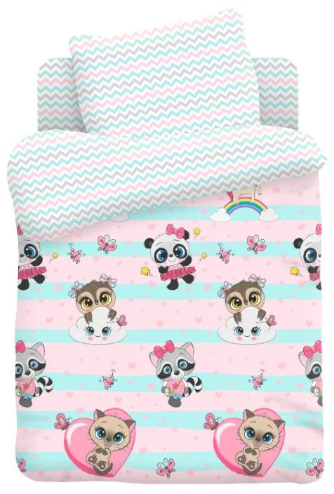 постель отличного качества, как написали выше простынь,наволочка и одна сторона пододеяльника зигзагами, а с одной стороны котики 👍👍👍👍👍