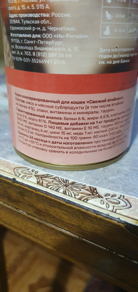 А кошка поела с удовольствие, брала впервые ж/б банку корма, обычно ела простые вискасы, а тут содержимое в виде супа с кусочками мяса, на запах вполне хорош, как и на вкус подтвердила кошка. Вскрытую банку храню в холодильнике, потому что за раз такой объём нас не под силу)