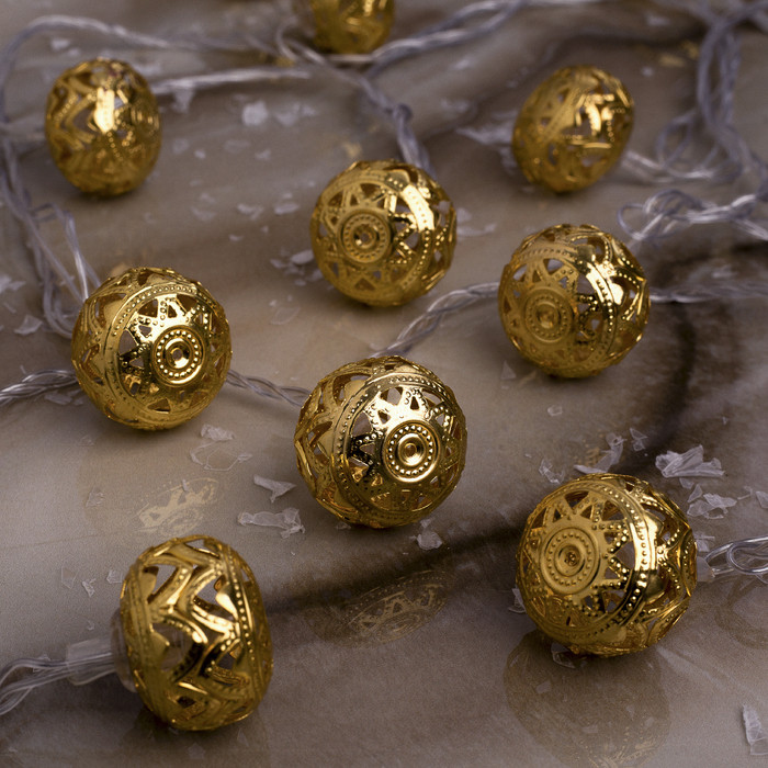 Очень красивая гирлянда, яркий тёплый цвет свечения. Ажурные золотистые шарики создают совершенно сказочное настроение немного "под старину". Хорошо будет смотреться и на ёлке, и в декоративной композиции, и просто на полке или комоде/камине как интерьерное украшение.