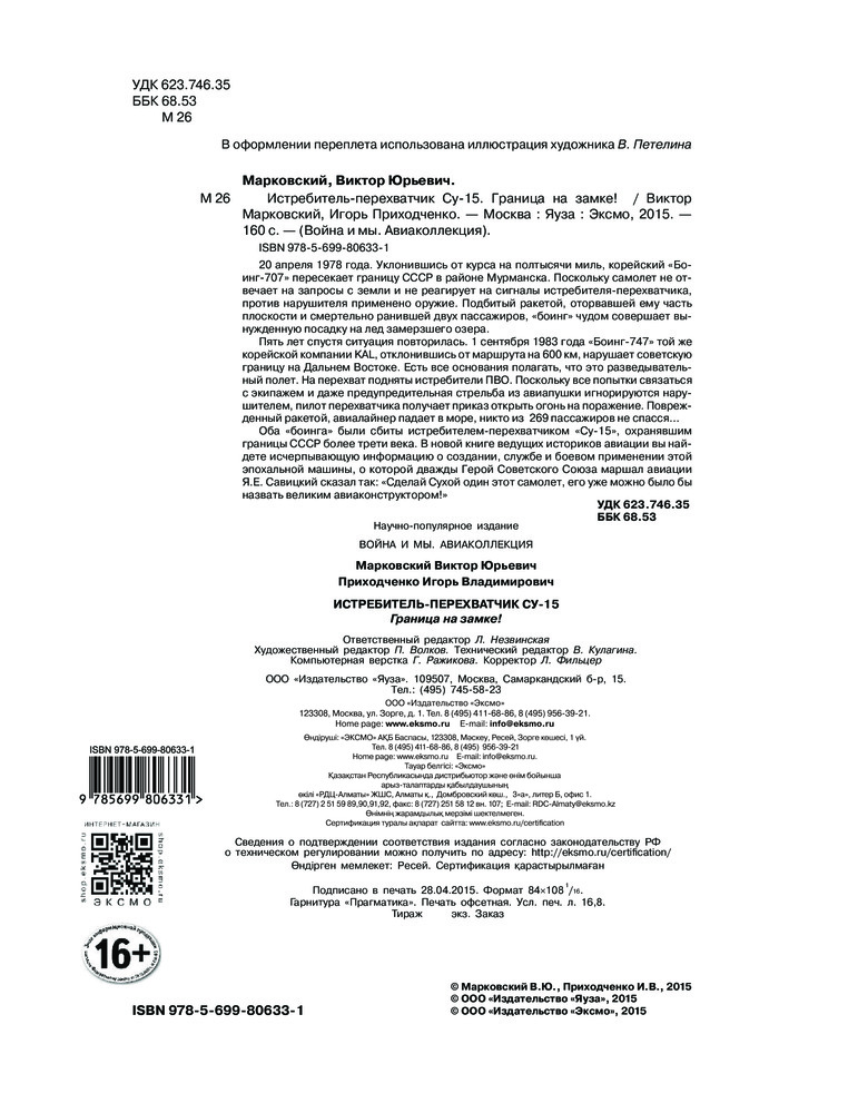 Истребитель-перехватчик Су-15. Граница на замке!Виктор Юрьевич Марковский, Игорь Владимирович Приходченко В данный момент этот товар отсутствует в продаже. Возможно, у нас найдется аналогичный или похожий товар здесь. Серия: Война и мы. Авиаколлекция 20 апреля 1978 года. Уклонившись от курса на полтысячи миль, корейский «Боинг-707» пересекает границу СССР в районе Мурманска. Поскольку самолет не отвечает на запросы с земли и не реагирует на сигналы истребителя-перехватчика, против нарушителя применено оружие. Подбитый ракетой, оторвавшей ему часть плоскости и смертельно ранившей двух пассажиров, «боинг» чудом совершает вынужденную посадку на лед замерзшего озера. |