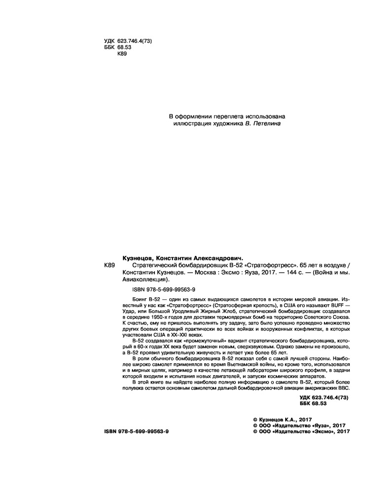 Стратегический бомбардировщик В-52 «Стратофортресс». 65 лет в воздухеКонстантин Александрович Кузнецов В данный момент этот товар отсутствует в продаже. Возможно, у нас найдется аналогичный или похожий товар здесь. Серия: Война и мы. Авиаколлекция Боинг В-52 — один из самых выдающихся самолетов в истории мировой авиации. Известный у нас как Стратофортресс (Стратосферная крепость), в США его называют BUFF — Удар или Большой Уродливый Жирный Жлоб, стратегический бомбардировщик создавался в середине 1950-х годов для доставки термоядерных бомб на территорию Советского Союза. К счастью, ему не пришлось выполнять эту задачу, зато было успешно проведено множество других боевых операций практически во всех войнах и вооруженных конфликтах, в которых участвовали США в ХХ—ХХI веках. |