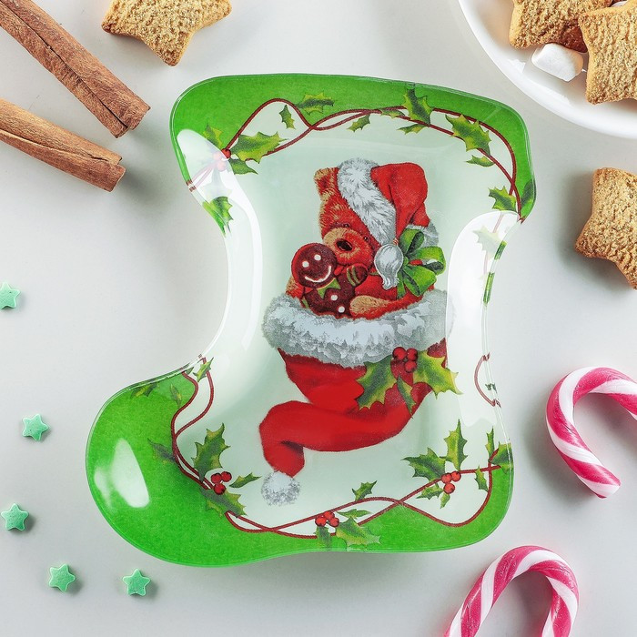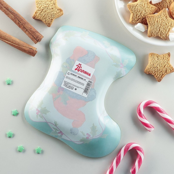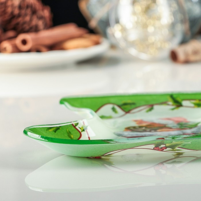Блюдо сервировочное выполнено из стекла с ярким праздничным рисунком. Блюдо можно использовать для сервировки новогоднего стола и в повседневной жизни.