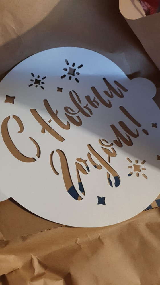 Шикарный трафарет. Использовала на медовом торте, оставила и на следующий год. Немного погнулся при транспортировке, прогладила утюгом и все отлично. Всем в семье понравилась надпись на торте.